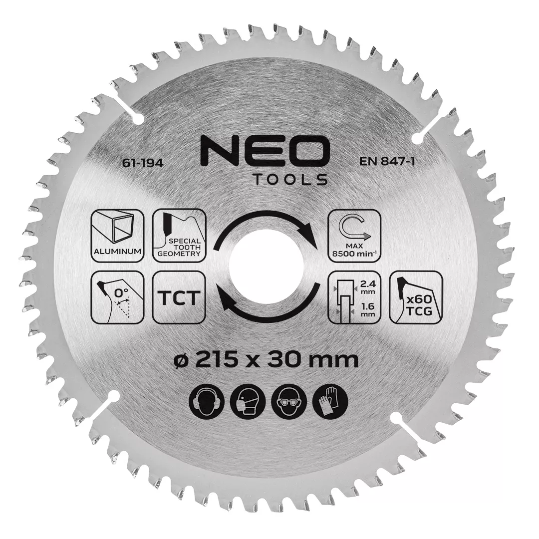 Tarcza do pilarki, widiowa, 215 x 30 mm, 60 zębów, do aluminium 61-194 marki NEO TOOLS wyposażona została w 60 zębów o wymiarach 2,4 mm x 1,6 mm, wykonanych z węglika spiekanego TCT. Ząb TCG, o specjalnej geometrii i szerokiej części grzebieniowej, gwarantuje zwiększoną wytrzymałość na obciążenia. Tarcza marki NEO TOOLS ze stali manganowej MN65 osiąga maksymalną prędkość obrotową do 8 500 obr./min. W zestawie znajdują się trzy pierścienie, umożliwiające redukcje do wymiarów: 30 x 25,4 mm, 30 x 20 mm i 30 x 16 mm. Tarcza NEO TOOLS przeznaczona jest do cięcia profili aluminiowych oraz innych metali kolorowych. Narzędzie zapewnia czystą i precyzyjną pracę.