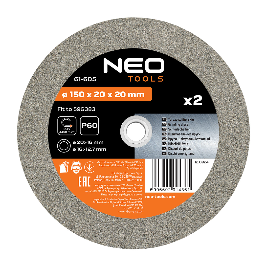 Tarcze szlifierskie 150 x 20 x 20 mm, 2 szt., 2 redukcje: 20x16 mm, 16x12.7 mm, P60, max. prędkość obrotowa 4 450 obr/min., kompatybilne z 59G383