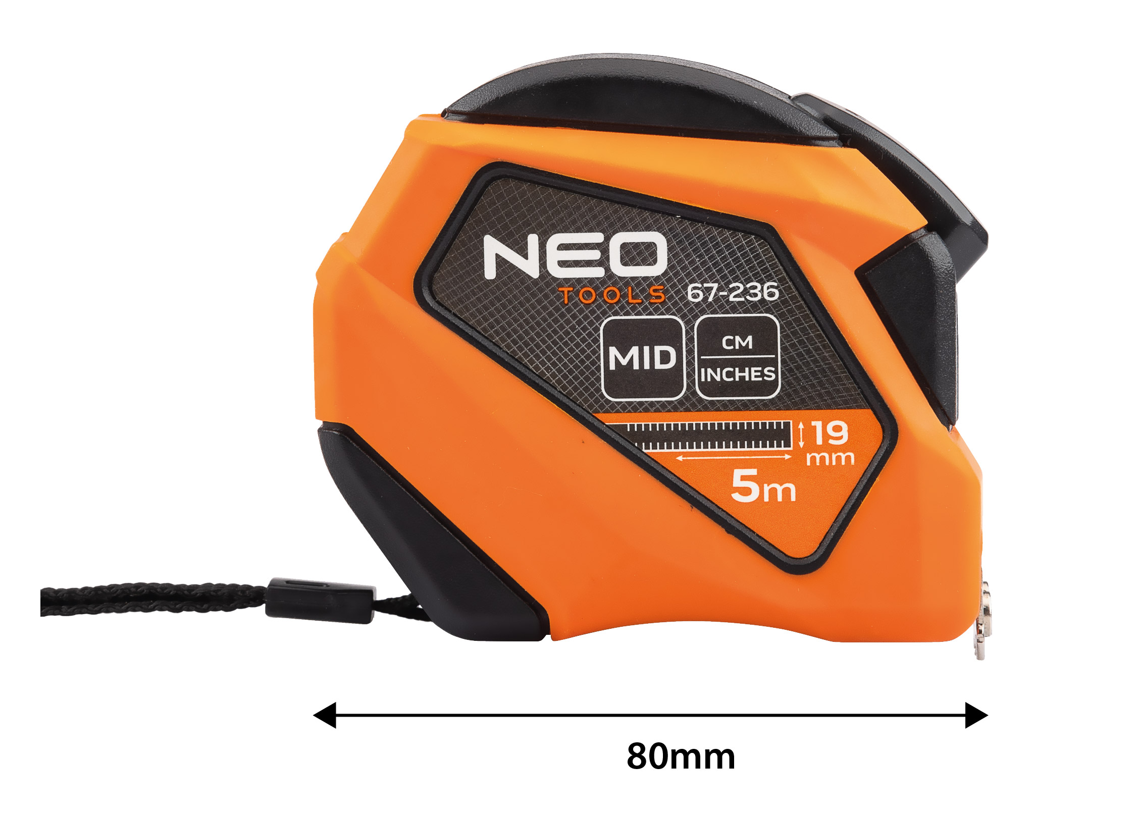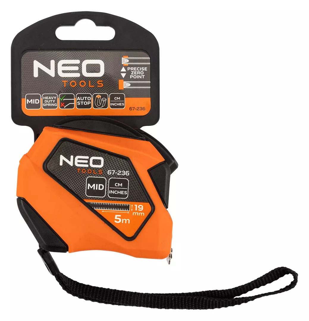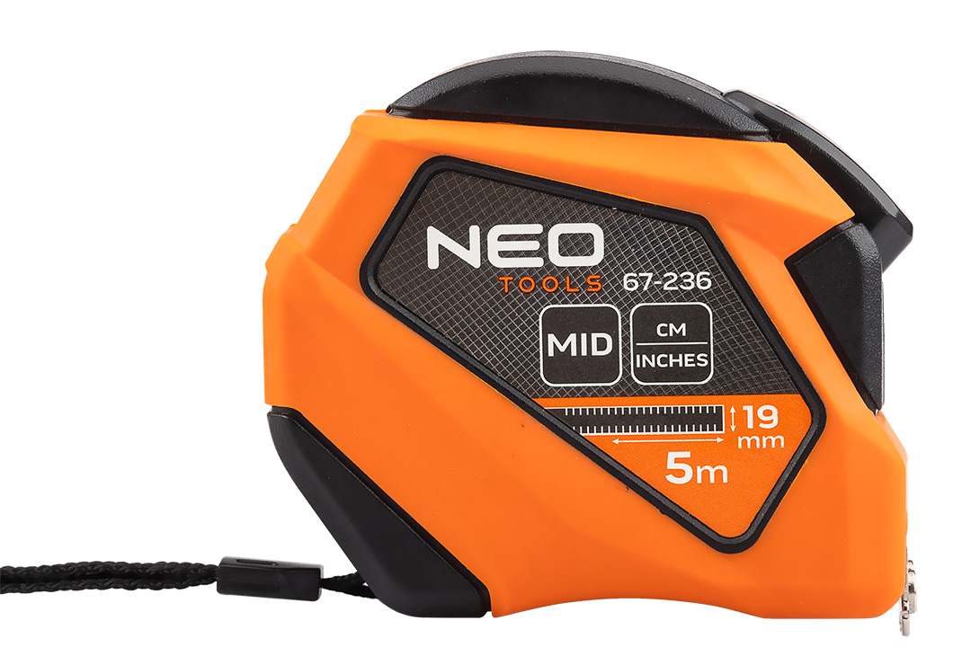 Miara zwijana stalowa 5 m x 19 mm, calowa 67-236 marki NEO TOOLS to narzędzie z taśmą o długości 5 m i szerokości 19 mm. Wyposażone w praktyczną funkcję autostopu, która zapobiega samoistnemu zwijaniu się miarki po wysunięciu, jak i możliwości użycia dwóch blokad. Magnes ułatwia lepszą stabilizację miary, a podwójna podziałka (metryczna i calowa) skutkuje sprawniejszym odczytaniem wyników w dowolnym systemie. Miara NEO TOOLS wykonana została z dwumateriałowej obudowy. Posiada lśniącą powłokę chroniącą podziałkę przed starciem. Z kolei wbudowany amortyzator wpływa na bardziej łagodny proces zwijania taśmy. Narzędzie posiada zgodność z dyrektywą MID class II. Dodatek nylonu wpływa na odpowiednią wytrzymałość oraz wygodę użytkowania tej miary NEO TOOLS.