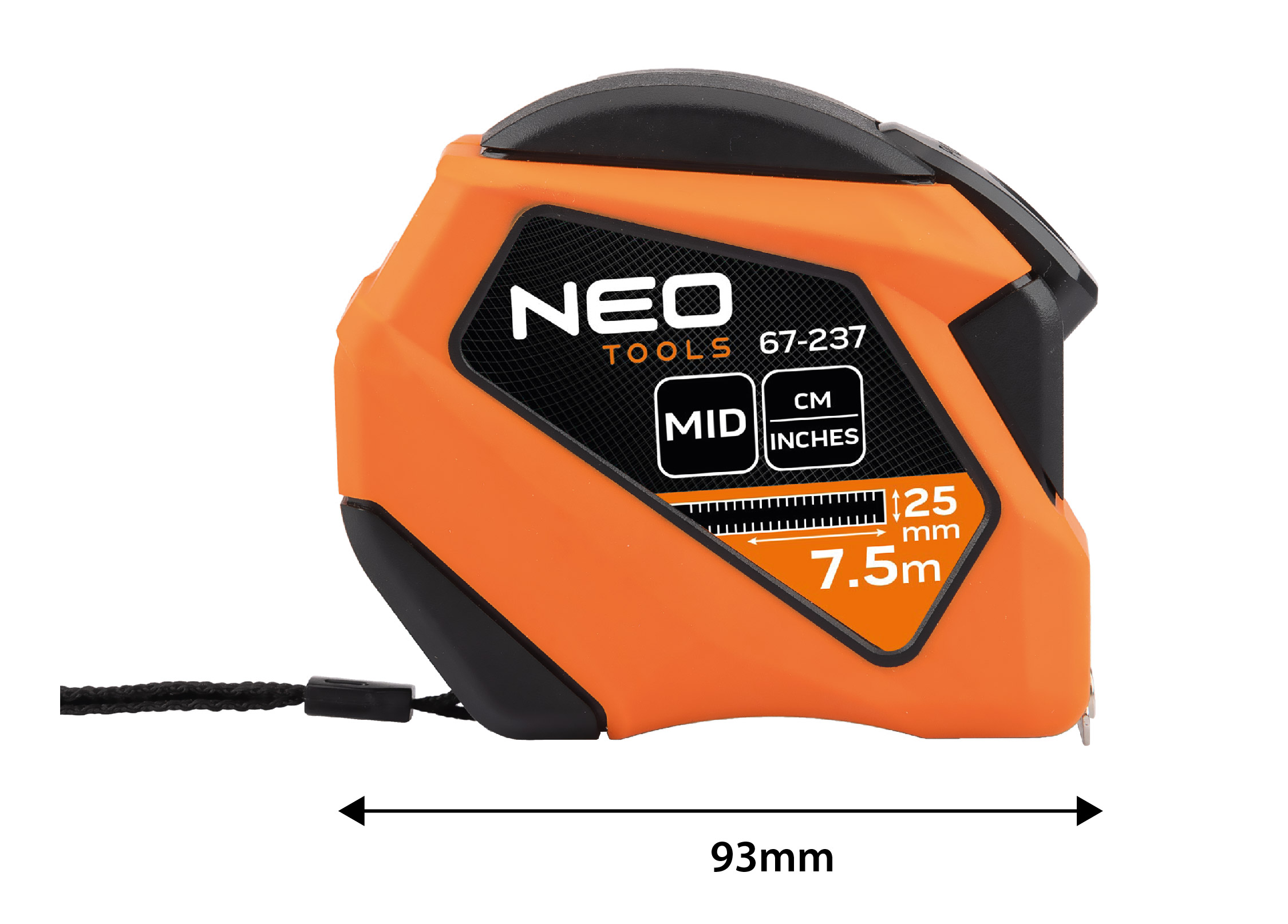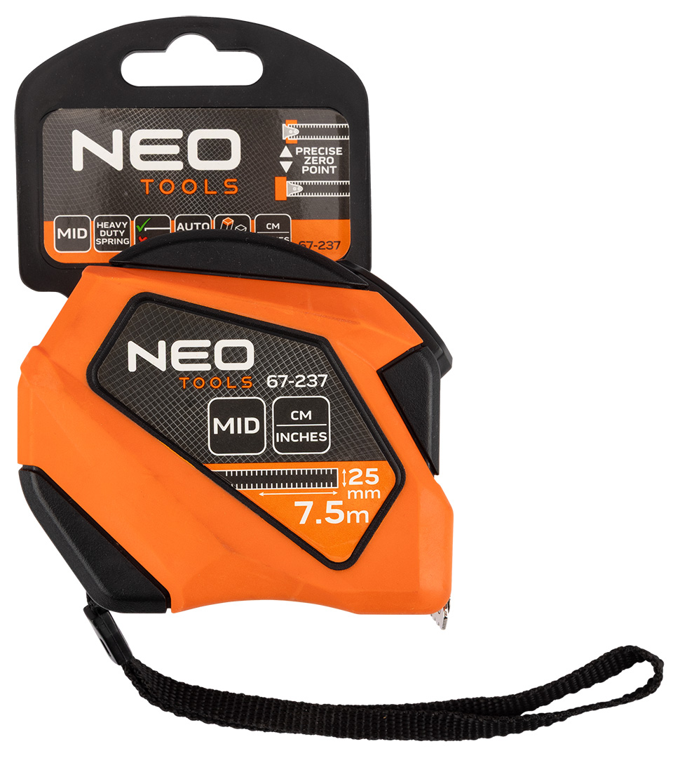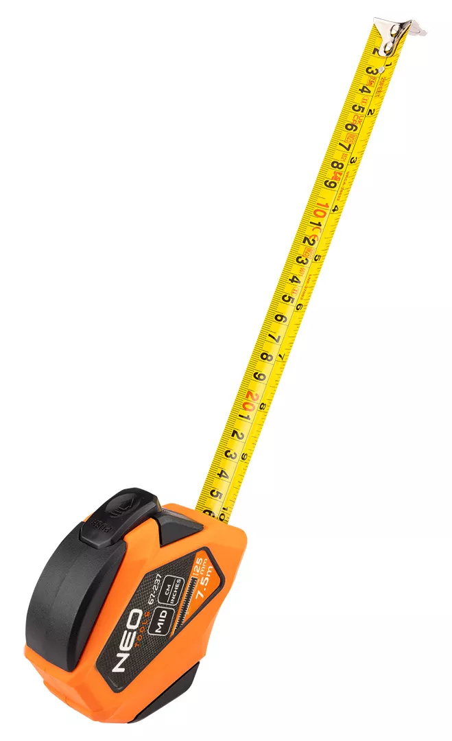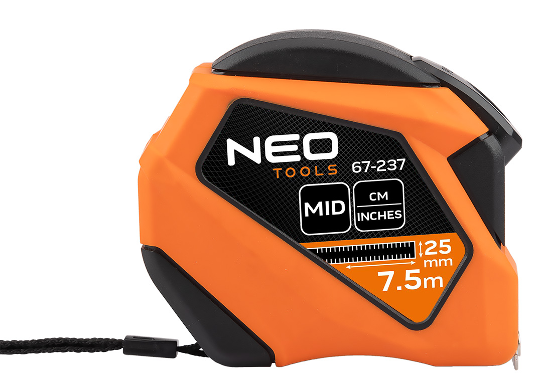 Miara zwijana stalowa 7,5 m x 25 mm, calowa 67-237 marki NEO TOOLS to narzędzie z taśmą o długości 7,5 m i szerokości 25 mm. Wyposażone w praktyczną funkcję autostopu, która zapobiega samoistnemu zwijaniu się miarki po wysunięciu, jak i możliwości użycia dwóch blokad. Magnes ułatwia lepszą stabilizację miary, a podwójna podziałka (metryczna i calowa) skutkuje sprawniejszym odczytaniem wyników w dowolnym systemie. Miara NEO TOOLS wykonana została z dwumateriałowej obudowy. Posiada lśniącą powłokę chroniącą podziałkę przed starciem. Z kolei wbudowany amortyzator wpływa na bardziej łagodny proces zwijania taśmy. Narzędzie posiada zgodność z dyrektywą MID class II. Dodatek nylonu wpływa na odpowiednią wytrzymałość oraz wygodę użytkowania tej miary NEO TOOLS.