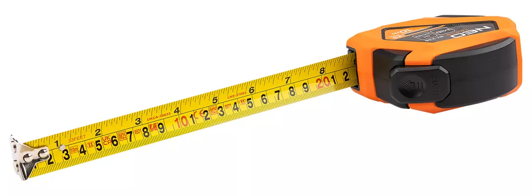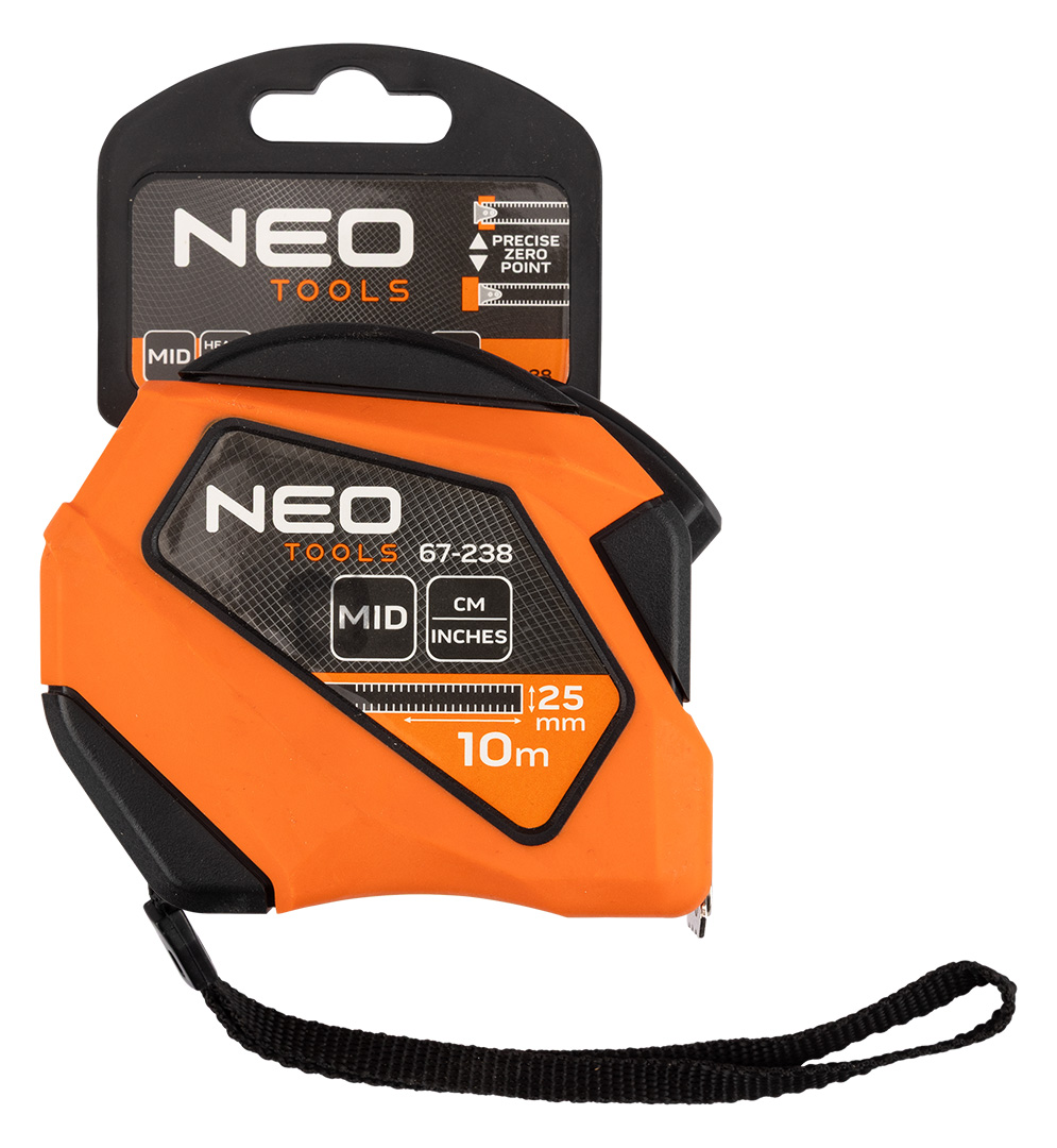 Miara zwijana stalowa 10 m x 25 mm, calowa 67-238 marki NEO TOOLS to narzędzie z taśmą o długości 10 m i szerokości 25 mm. Wyposażone w praktyczną funkcję autostopu, która zapobiega samoistnemu zwijaniu się miarki po wysunięciu, jak i możliwości użycia dwóch blokad. Magnes ułatwia lepszą stabilizację miary, a podwójna podziałka (metryczna i calowa) skutkuje sprawniejszym odczytaniem wyników w dowolnym systemie. Miara NEO TOOLS wykonana została z dwumateriałowej obudowy. Posiada lśniącą powłokę chroniącą podziałkę przed starciem. Z kolei wbudowany amortyzator wpływa na bardziej łagodny proces zwijania taśmy. Narzędzie posiada zgodność z dyrektywą MID class II. Dodatek nylonu wpływa na odpowiednią wytrzymałość oraz wygodę użytkowania tej miary NEO TOOLS.
