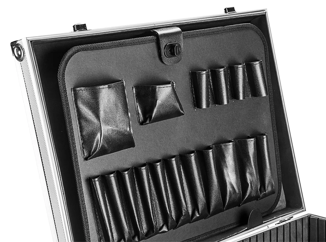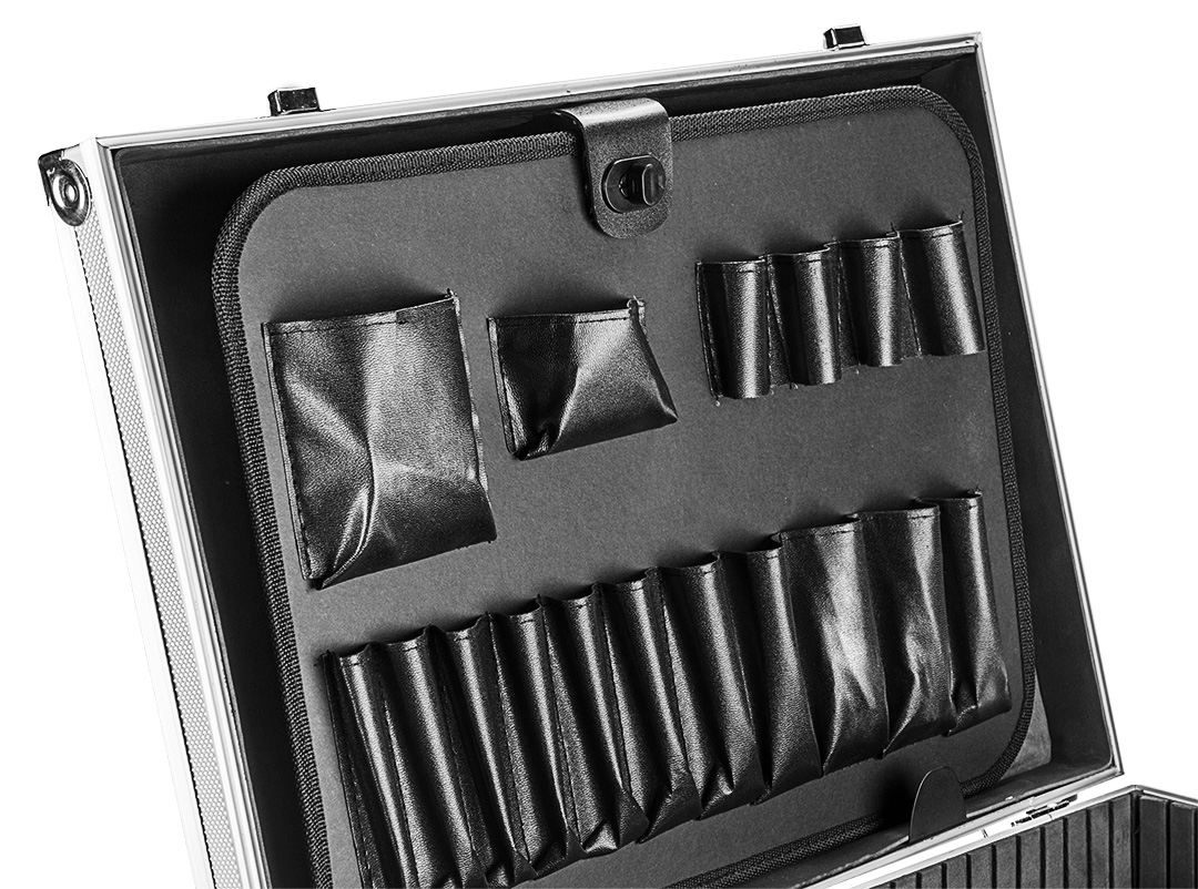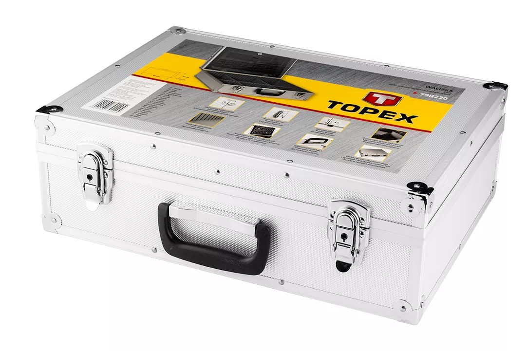 Walizka aluminiowa TOPEX (nr ref. 79R220) o wymiarach 45 x 15 x 32 cm. Walizka posiada lekką konstrukcję oraz system przegród i kieszeni, dzięki czemu ma wszechstronne zastosowanie. Wnętrze walizki wyściełane miękkim materiałem chroni przenoszone przedmioty. Dodatkowo wzmocnione krawędzie chronią walizkę przed zniszczeniem. Wyposażona w dwa zamki na kluczyk. Marka TOPEX skierowana jest do majsterkowiczów.