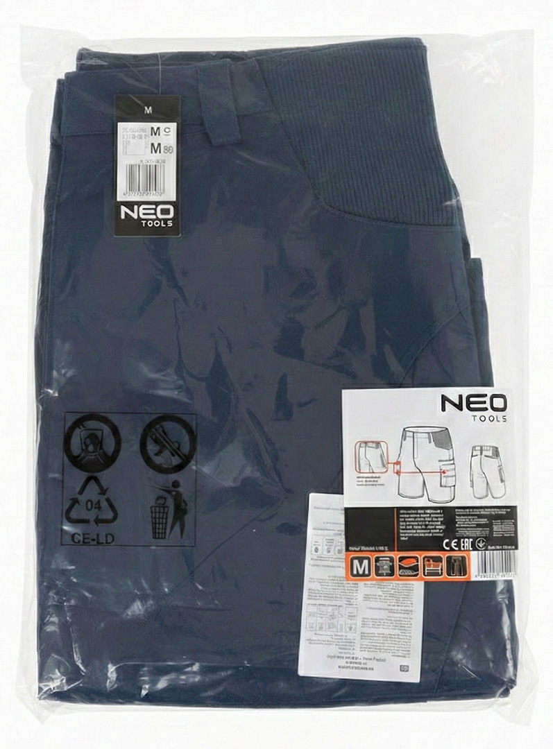 Krótkie spodenki Mix&Match, guma w pasie, granatowe, rozmiar M, 81-275-M marki NEO TOOLS to odzież przeznaczona do codziennego noszenia. Spodnie wykonane z materiału o składzie 62% bawełna, 35% poliester, 3% elastan i gramaturze 270 g/m², zapewniają trwałość oraz komfort użytkowania. Materiał z dodatkiem elastanu zwiększa swobodę ruchów, a elastyczne panele po bokach poprawiają dopasowanie do sylwetki. Spodenki posiadają elementy wzmacniane z materiału Cordura®, elastyczną gumę w pasie oraz wielofunkcyjne, pojemne kieszenie. Wyposażone są również w wewnętrzną wszywkę imienną. Model wyróżnia się unikalnym projektem własnym marki NEO TOOLS i posiada certyfikat CE zgodny z normą EN ISO 13688:2013.