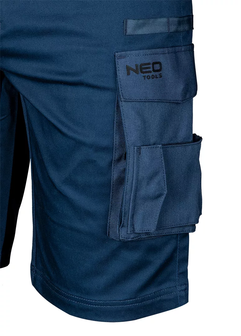 Krótkie spodenki Mix&Match, guma w pasie, granatowe, rozmiar XS, 81-275-XS marki NEO TOOLS to odzież przeznaczona do codziennego noszenia. Spodnie wykonane z materiału o składzie 62% bawełna, 35% poliester, 3% elastan i gramaturze 270 g/m², zapewniają trwałość oraz komfort użytkowania. Materiał z dodatkiem elastanu zwiększa swobodę ruchów, a elastyczne panele po bokach poprawiają dopasowanie do sylwetki. Spodenki posiadają elementy wzmacniane z materiału Cordura®, elastyczną gumę w pasie oraz wielofunkcyjne, pojemne kieszenie. Wyposażone są również w wewnętrzną wszywkę imienną. Model wyróżnia się unikalnym projektem własnym marki NEO TOOLS i posiada certyfikat CE zgodny z normą EN ISO 13688:2013.