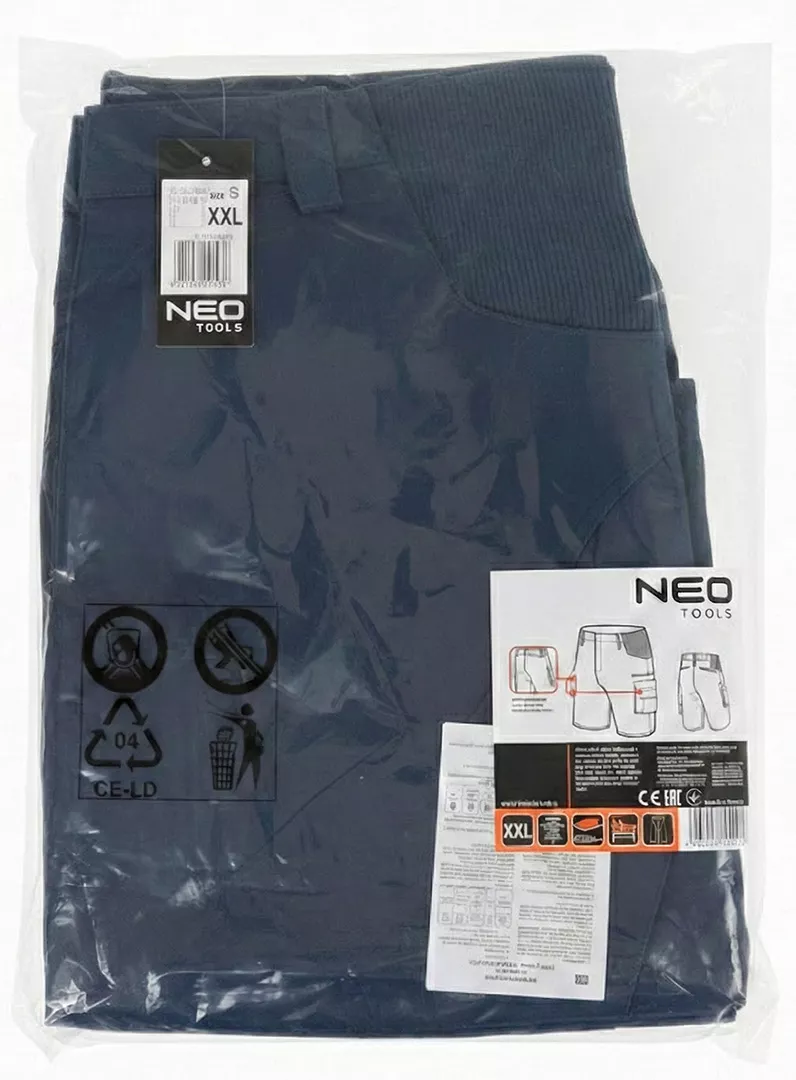 Krótkie spodenki Mix&Match, guma w pasie, granatowe, rozmiar XXL, 81-275-XXL marki NEO TOOLS to odzież przeznaczona do codziennego noszenia. Spodnie wykonane z materiału o składzie 62% bawełna, 35% poliester, 3% elastan i gramaturze 270 g/m², zapewniają trwałość oraz komfort użytkowania. Materiał z dodatkiem elastanu zwiększa swobodę ruchów, a elastyczne panele po bokach poprawiają dopasowanie do sylwetki. Spodenki posiadają elementy wzmacniane z materiału Cordura®, elastyczną gumę w pasie oraz wielofunkcyjne, pojemne kieszenie. Wyposażone są również w wewnętrzną wszywkę imienną. Model wyróżnia się unikalnym projektem własnym marki NEO TOOLS i posiada certyfikat CE zgodny z normą EN ISO 13688:2013.