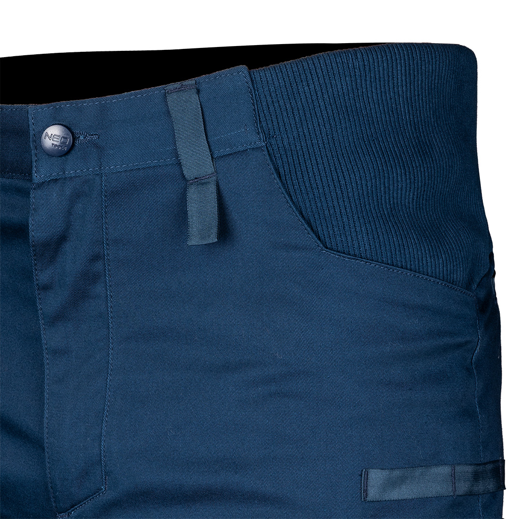 Krótkie spodenki Mix&Match, guma w pasie, granatowe, rozmiar XXXL, 81-275-XXXL marki NEO TOOLS to odzież przeznaczona do codziennego noszenia. Spodnie wykonane z materiału o składzie 62% bawełna, 35% poliester, 3% elastan i gramaturze 270 g/m², zapewniają trwałość oraz komfort użytkowania. Materiał z dodatkiem elastanu zwiększa swobodę ruchów, a elastyczne panele po bokach poprawiają dopasowanie do sylwetki. Spodenki posiadają elementy wzmacniane z materiału Cordura®, elastyczną gumę w pasie oraz wielofunkcyjne, pojemne kieszenie. Wyposażone są również w wewnętrzną wszywkę imienną. Model wyróżnia się unikalnym projektem własnym marki NEO TOOLS i posiada certyfikat CE zgodny z normą EN ISO 13688:2013.