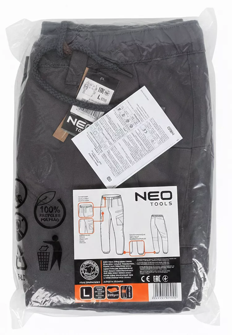 Spodnie robocze OUTDOOR, typu jogger, szare, rozmiar L 81-285-2-L marki NEO TOOLS to spodnie w kolorze szarym, charakteryzujące się tkaniną o splocie dobby o składzie 80% bawełna, 17% poliester i 3% spandex. Gramatura wynosi 280 g/m2. Wyposażone w gumkę i dodatkowy sznurek w pasie. Brak zapięcia na przodzie. Spodnie NEO TOOLS posiadają kieszenie boczne z wypustką, dodatkowe kieszenie na udach na zamek i kieszenie przestrzenne nad kolanem. Profilowane kolano na przodzie i tyle zapewnia większą wygodę. W dole nogawki mankiet z gumką od zewnętrznej strony gwarantuje swobodę ruchów. Z kolei dwie kieszenie z wypustką zapinane na zamek zapewniają większe możliwości przechowywania. Posiada drukowane logo na patce kieszeni nad kolanem, a także wszywkę imienną do lepszej personalizacji. Spodnie robocze OUTDOOR typu jogger jest unikalnym projektem własnym NEO TOOLS.
