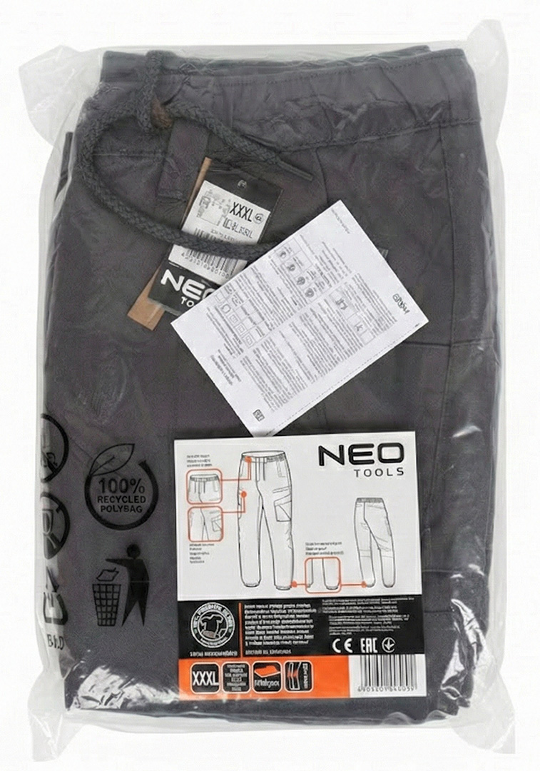 Spodnie robocze OUTDOOR, typu jogger, szare, rozmiar XXXL 81-285-2-XXXL marki NEO TOOLS to spodnie w kolorze szarym, charakteryzujące się tkaniną o splocie dobby o składzie 80% bawełna, 17% poliester i 3% spandex. Gramatura wynosi 280 g/m2. Wyposażone w gumkę i dodatkowy sznurek w pasie. Brak zapięcia na przodzie. Spodnie NEO TOOLS posiadają kieszenie boczne z wypustką, dodatkowe kieszenie na udach na zamek i kieszenie przestrzenne nad kolanem. Profilowane kolano na przodzie i tyle zapewnia większą wygodę. W dole nogawki mankiet z gumką od zewnętrznej strony gwarantuje swobodę ruchów. Z kolei dwie kieszenie z wypustką zapinane na zamek zapewniają większe możliwości przechowywania. Posiada drukowane logo na patce kieszeni nad kolanem, a także wszywkę imienną do lepszej personalizacji. Spodnie robocze OUTDOOR typu jogger jest unikalnym projektem własnym NEO TOOLS.