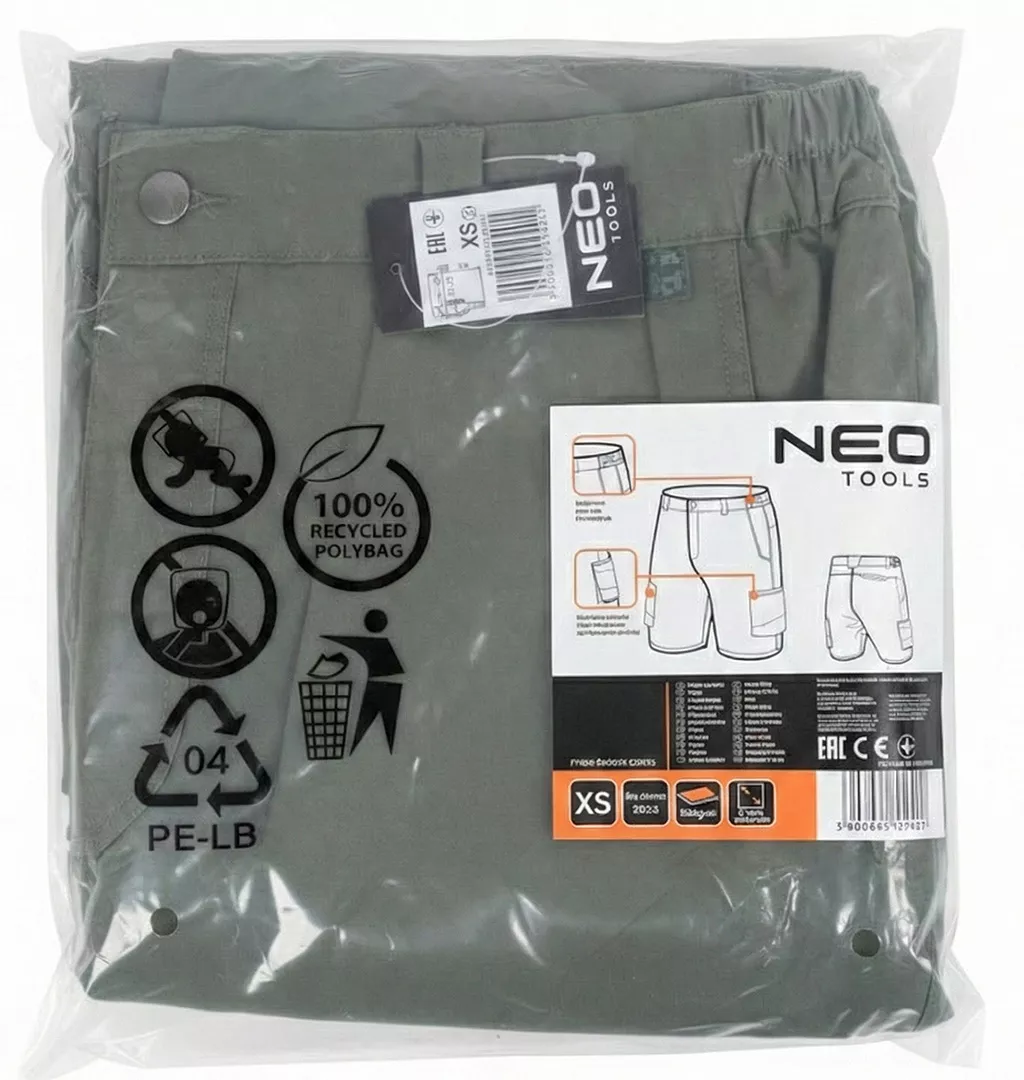 Krótkie spodenki Mix&Match 2way stretch, zielone, rozmiar XS, 81-299-1-XS marki NEO TOOLS to model przeznaczony do codziennego noszenia, wykonany z elastycznej tkaniny 2way stretch. Miękkie w dotyku (technologia cotton touch), posiadają skład materiałowy 100% poliester oraz gramaturę 185 g/m². Spodenki wyposażone zostały w gumę w pasie, dwie kieszenie zapinane na zamek oraz jedną kieszeń zapinaną na guzik. Zastosowana wytrzymała, elastyczna tkanina zapewnia komfort użytkowania. Spodenki NEO TOOLS posiadają wszywkę imienną oraz zgodność z certyfikatem CE.