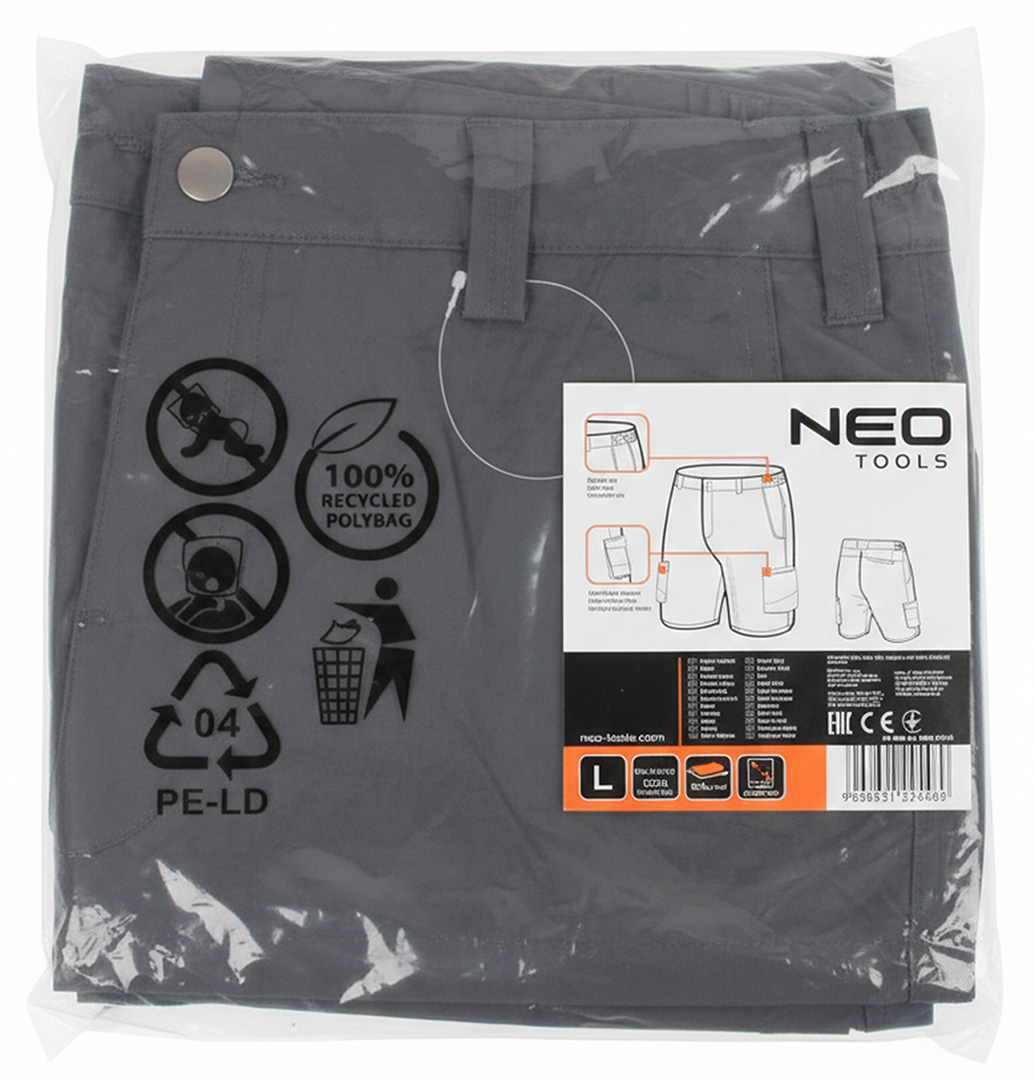 Krótkie spodenki Mix&Match 2way stretch, grafitowe, rozmiar L, 81-299-2-L marki NEO TOOLS to model przeznaczony do codziennego noszenia, wykonany z elastycznej tkaniny 2way stretch. Miękkie w dotyku (technologia cotton touch), posiadają skład materiałowy 100% poliester oraz gramaturę 185 g/m². Spodenki wyposażone zostały w gumę w pasie, dwie kieszenie zapinane na zamek oraz jedną kieszeń zapinaną na guzik. Zastosowana wytrzymała, elastyczna tkanina zapewnia komfort użytkowania. Spodenki NEO TOOLS posiadają wszywkę imienną oraz zgodność z certyfikatem CE.