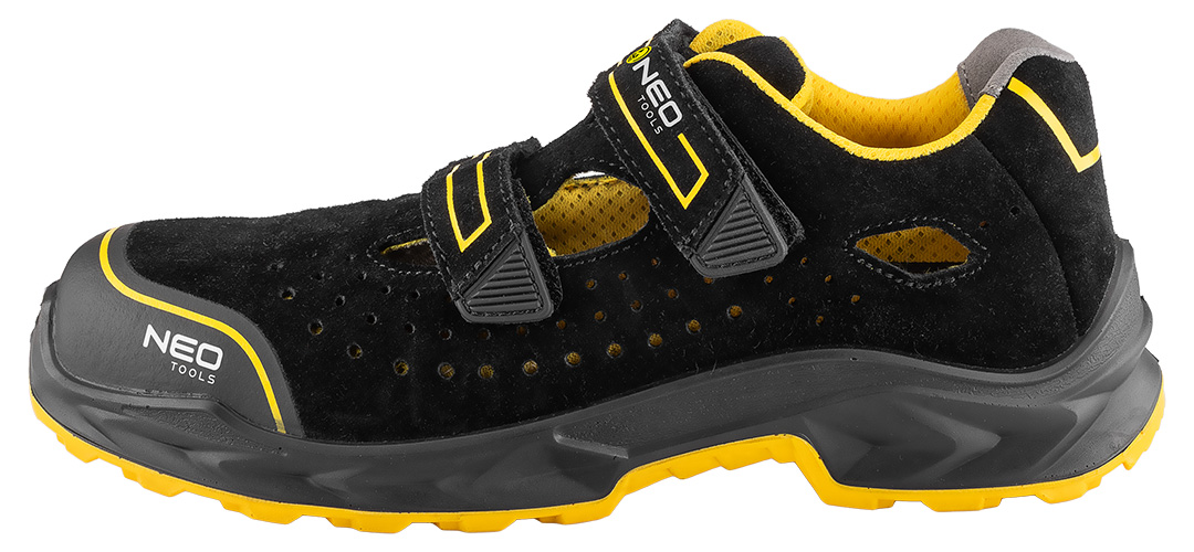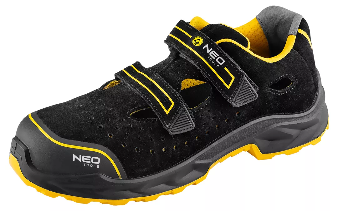 Sandały robocze S1 FO SR, ESD 82-069-44 marki NEO TOOLS to obuwie wykonane z myślą o pracy w środowiskach przemysłowych wymagających ochrony stopy, komfortu oraz kontroli ładunków elektrostatycznych. Cholewka ze skóry bydlęcej w połączeniu z wyściółką z dzianiny siatkowej oraz licznymi otworami wentylacyjnymi zapewnia lepszą cyrkulację powietrza i ogranicza przegrzewanie stopy. Zastosowana podeszwa PU/PU spełnia wymagania klasy FO, co oznacza odporność na benzynę i oleje; natomiast klasa SR jest potwierdzeniem odporności na poślizg na podłożu ceramicznym pokrytym roztworem laurylosiarczanu sodu (SLS). Obuwie NEO TOOLS wyposażono w kompozytowy podnosek, który chroni palce; a także zapięcie na rzepy, umożliwiające szybkie dopasowanie buta do stopy. Wkładka z pianki HI-POLY poprawia komfort użytkowania podczas długotrwałej pracy. Sandały posiadają właściwości antyelektrostatyczne ESD, z wąskim zakresem oporu elektrycznego od 0,75 MΩ do 35 MΩ, skutecznie odprowadzając ładunki elektryczne. Model przeznaczony jest do zastosowań m.in. w przemyśle elektronicznym, komputerowym, chemicznym, samochodowym, farmaceutycznym, optycznym, spożywczym, lotniczym oraz petrochemicznym. Obuwie NEO TOOLS dostępne jest w rozmiarach 39–47 i posiada certyfikat CE potwierdzający zgodność z normą EN ISO.