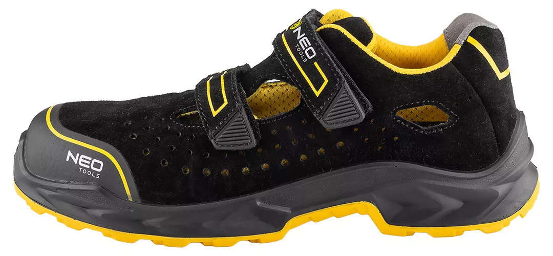Sandały robocze S1 FO SR, ESD 82-069-46 marki NEO TOOLS to obuwie wykonane z myślą o pracy w środowiskach przemysłowych wymagających ochrony stopy, komfortu oraz kontroli ładunków elektrostatycznych. Cholewka ze skóry bydlęcej w połączeniu z wyściółką z dzianiny siatkowej oraz licznymi otworami wentylacyjnymi zapewnia lepszą cyrkulację powietrza i ogranicza przegrzewanie stopy. Zastosowana podeszwa PU/PU spełnia wymagania klasy FO, co oznacza odporność na benzynę i oleje; natomiast klasa SR jest potwierdzeniem odporności na poślizg na podłożu ceramicznym pokrytym roztworem laurylosiarczanu sodu (SLS). Obuwie NEO TOOLS wyposażono w kompozytowy podnosek, który chroni palce; a także zapięcie na rzepy, umożliwiające szybkie dopasowanie buta do stopy. Wkładka z pianki HI-POLY poprawia komfort użytkowania podczas długotrwałej pracy. Sandały posiadają właściwości antyelektrostatyczne ESD, z wąskim zakresem oporu elektrycznego od 0,75 MΩ do 35 MΩ, skutecznie odprowadzając ładunki elektryczne. Model przeznaczony jest do zastosowań m.in. w przemyśle elektronicznym, komputerowym, chemicznym, samochodowym, farmaceutycznym, optycznym, spożywczym, lotniczym oraz petrochemicznym. Obuwie NEO TOOLS dostępne jest w rozmiarach 39–47 i posiada certyfikat CE potwierdzający zgodność z normą EN ISO.