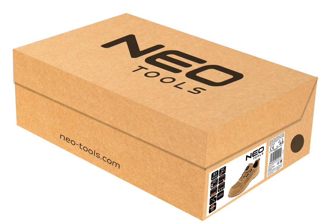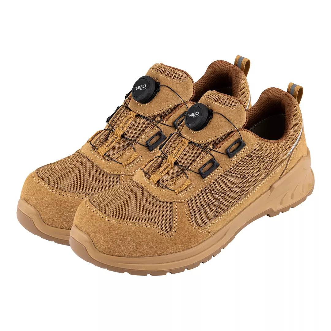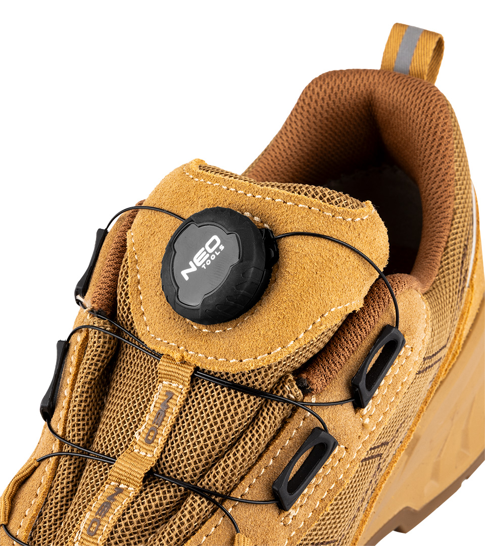 Półbuty robocze S1 SR FO, linkowe wiązanie z pokrętłem, rozmiar 43, 82-174-43 marki NEO TOOLS to obuwie, które wyposażone zostało w linkowe wiązanie z pokrętłem, umożliwiające szybkie oraz precyzyjne dopasowanie. Cholewka wykonana ze skóry i dzianiny poliestrowej, wyściółka z dzianiny siatkowej, a także podeszwa z poliuretanu (PU/PU) – gwarantują solidność modelu. Wkładka z pianki HI-POLY zapewnia z kolei wysoki komfort użytkowania. Obuwie NEO TOOLS posiada kompozytowy podnosek chroniący przed uderzeniami o energii 200 J. Model należy do kategorii S1 SR FO – charakteryzując się odpornością na poślizg na podłożu ceramicznym pokrytym roztworem laurylosiarczanu sodu (SLS). Produkt posiada certyfikat CE