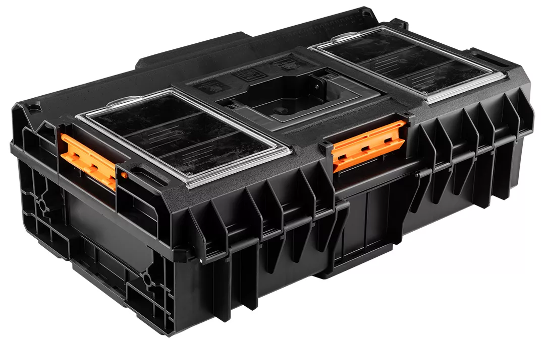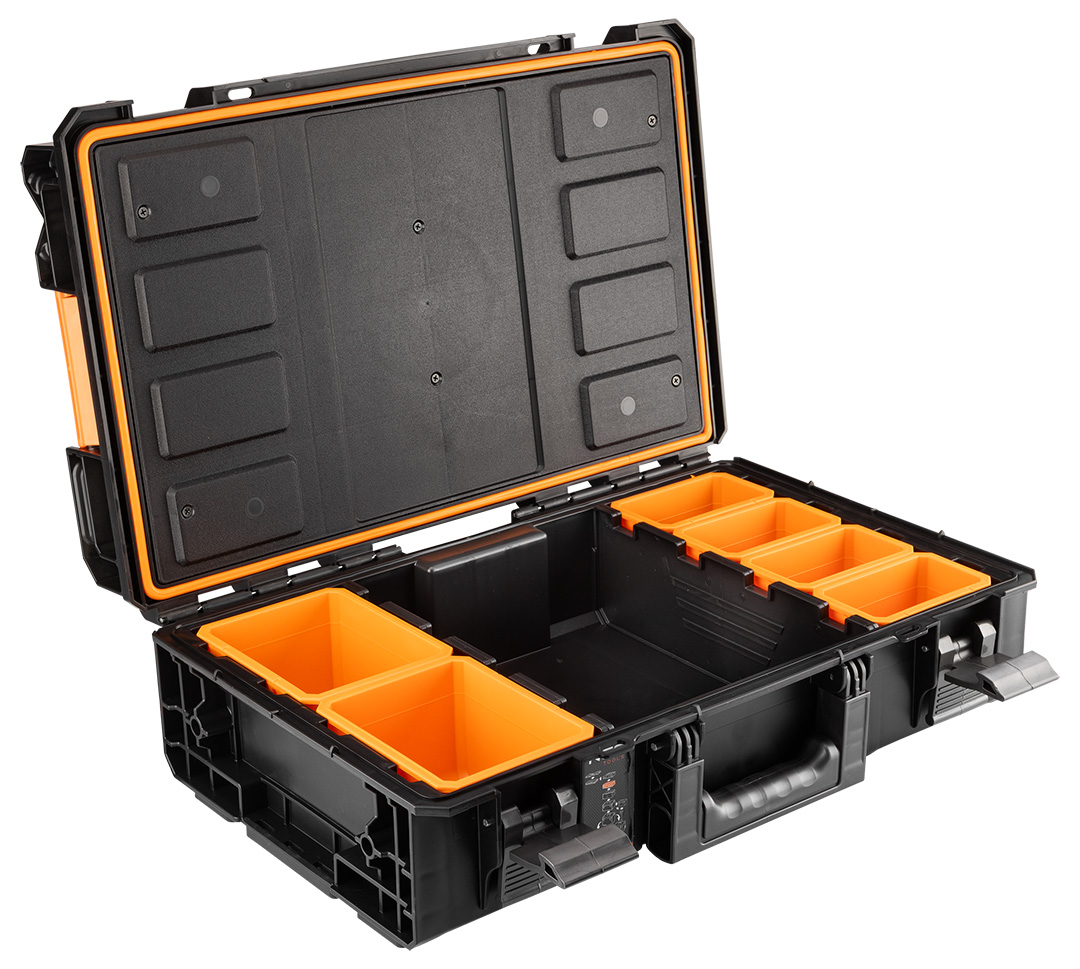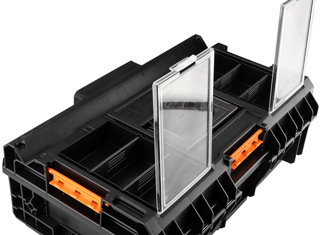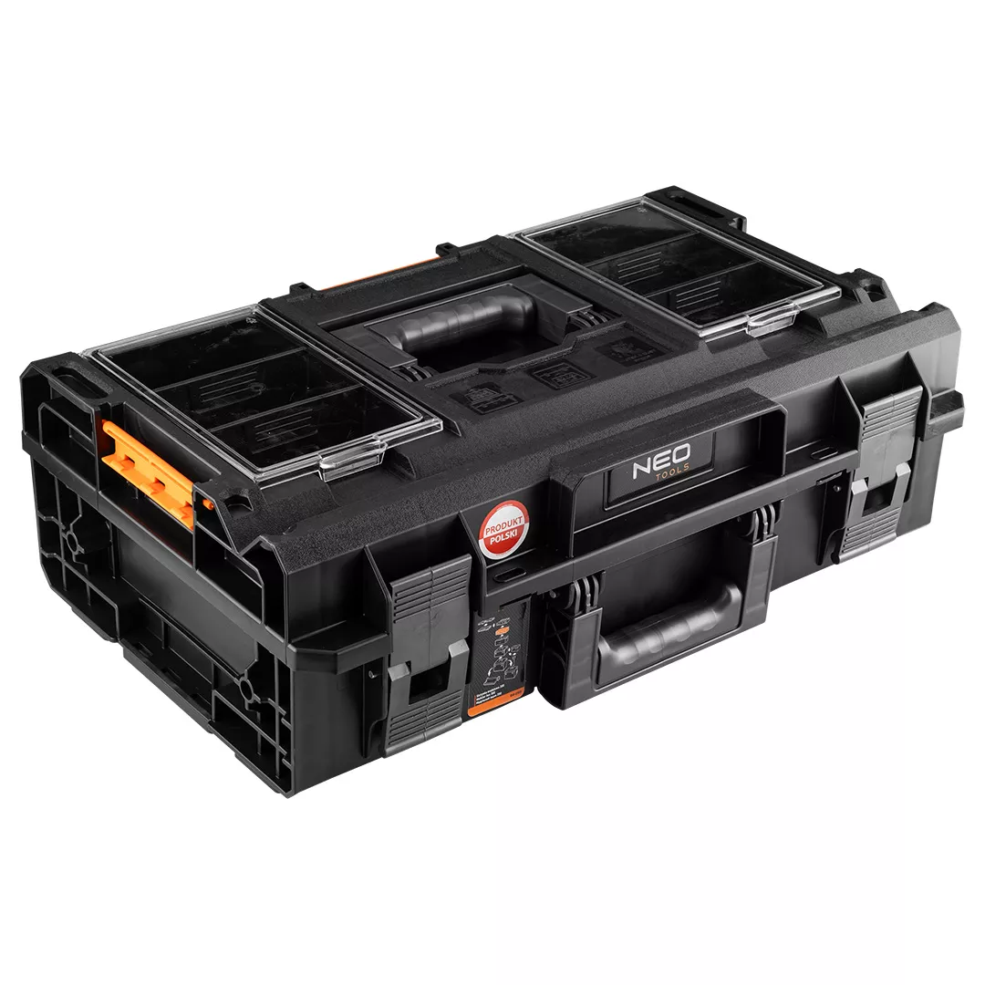 Skrzynka modułowa 200 NEO (nr. Ref 84-255) to mocna skrzynia do przenoszenia i magazynowania narzędzi budowlanch. Uszczelka w pokrywie skutecznie chroni narzędzia przed kurzem i wilgocią. Wnęka z miarką w pokrywie pozwala na mocny chwyt i łatwe cięcia rur, listew itp. Orgazniery w pokrywie pozwolą na podręczne magazynowanie. Dodatkowe 6 kubełków zwiększa możliwości pracy.