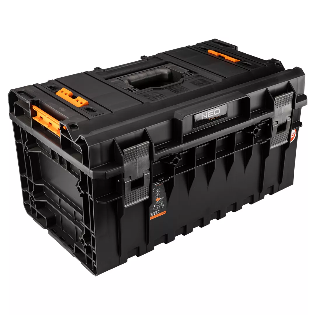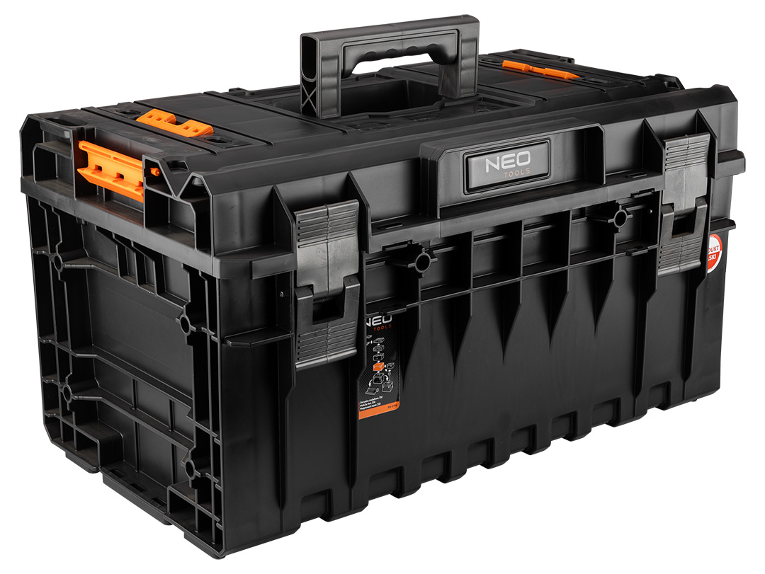 Skrzynka modułowa 350 NEO (nr. Ref 84-256) to mocna skrzynia do przenoszenia i magazynowania narzędzi budowlanch. Uszczelka w pokrywie skutecznie chroni narzędzia przed kurzem i wilgocią. Mocna konstrukcja pozwala stanąć na niej osobie do 120 kg. Duż pojmność pozwoli na przenoszenie nawet największych narzędzi i elektronarzędzi. Przegrody wewnętrzn podnoszą użyteczność skrzyni. Mocny uchwyt pozwoli na przeniesie do 50 kg narzędzi.