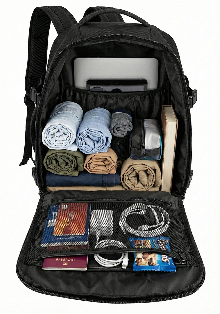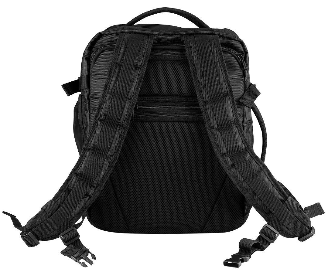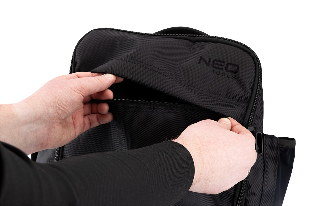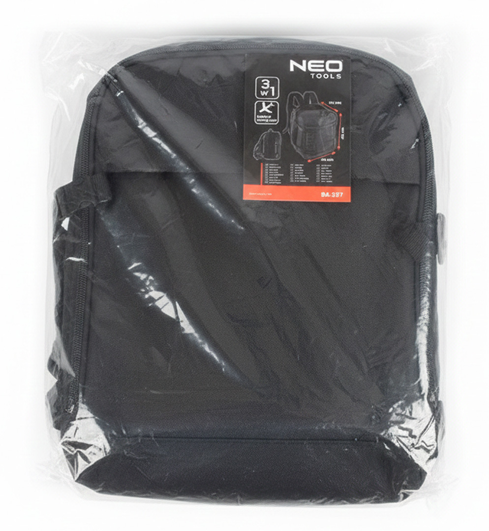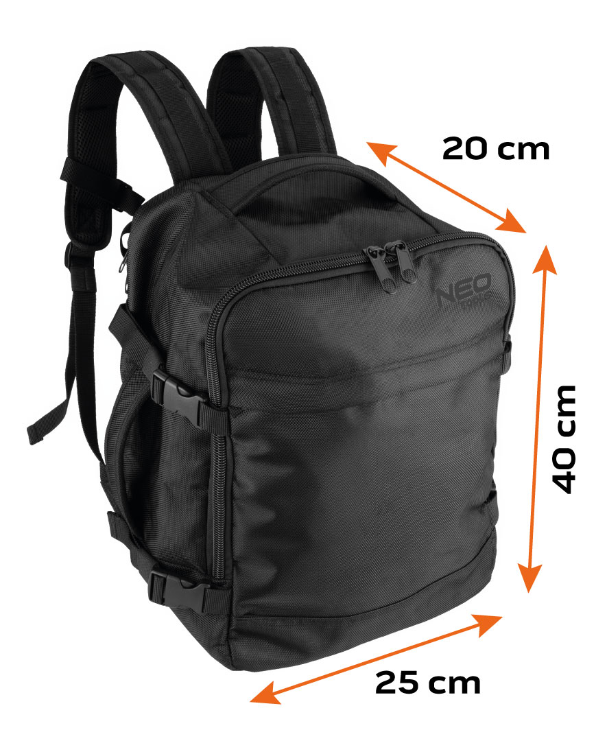 Plecak 3w1, 40 x 25 x 20 cm, 84-337 marki NEO TOOLS to czarny plecak podręczny przeznaczony do samolotu (Free On Board), do biura oraz w pracy monterskiej. Ma wymiary 40 x 25 x 20 cm, zgodne z wymaganiami bezpłatnego bagażu podręcznego wybranych linii lotniczych. Wyposażony jest w 4 kieszenie zewnętrzne (w tym regulowaną kieszeń boczną np. na butelkę z wodą oraz zasuwaną kieszeń na dokumenty z tyłu), a także 4 kieszenie wewnętrzne; w tym komorę na laptopa 15 cali. Plecak NEO TOOLS posiada regulowane pasy kompresyjne, górny i boczny uchwyt oraz możliwość umieszczenia na stelażu walizki. Dodatkowym elementem jest logo NEO TOOLS wykonane z nitki odblaskowej