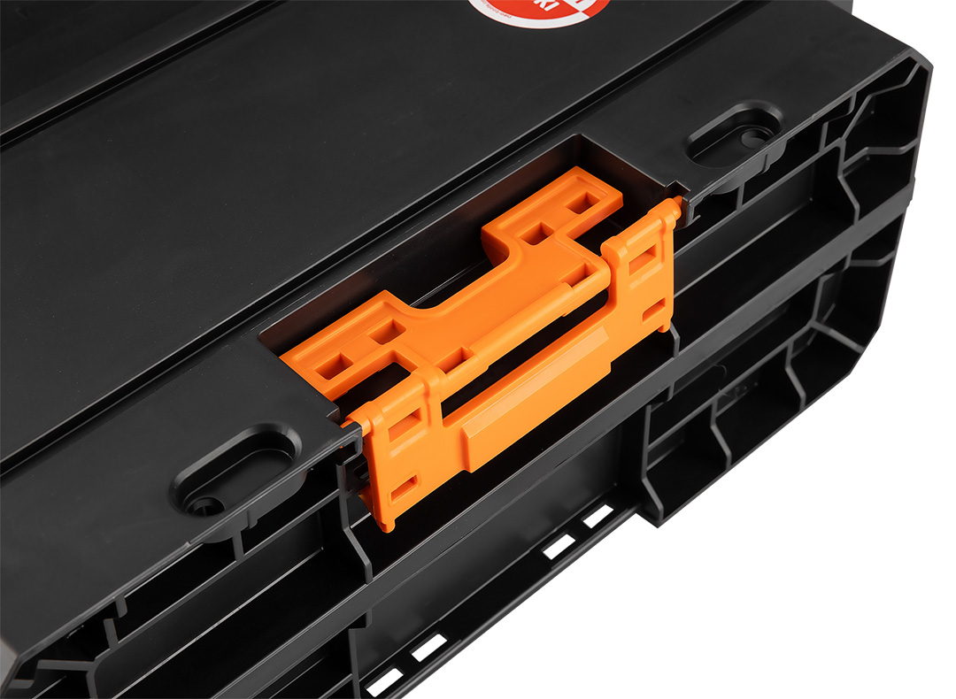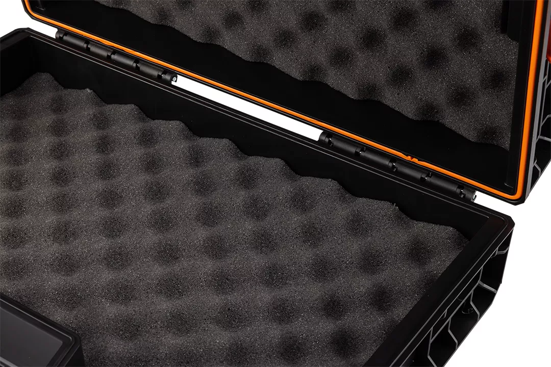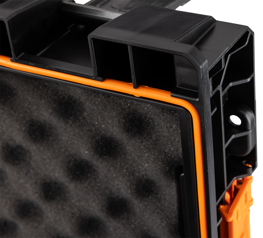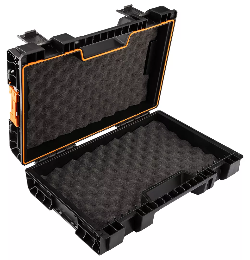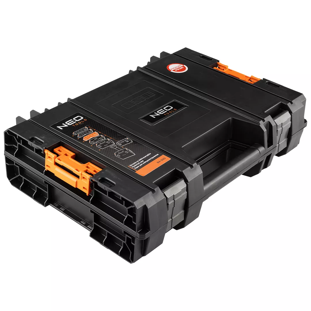 Skrzynia na elektronarzędzia NEO (nr ref. 84-350) o pojemności 11 litrów pozwala przechować urządzenia w bezpiecznych warunkach oraz pomaga w zachowaniu porządku. Produkt jest odporny na wodę oraz pył, dzięki uszczelce zamontowanej w pokrywie. Wzmocniona konstrukcja korpusu sprawia, że skrzynia jest odporna na uszkodzenia mechaniczne. Wnętrze skrzynki wyłożone jest miękką pianką ochronną