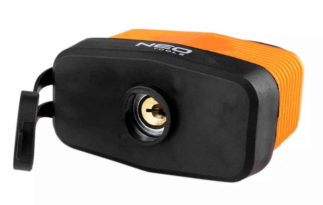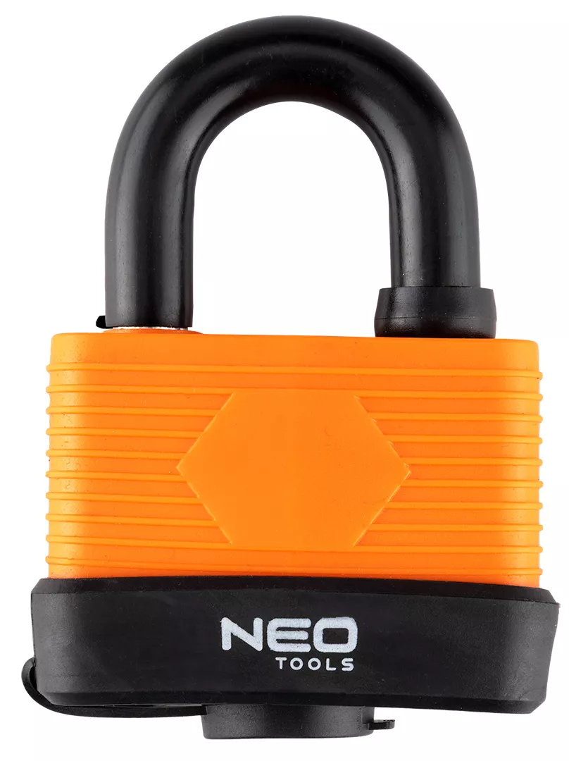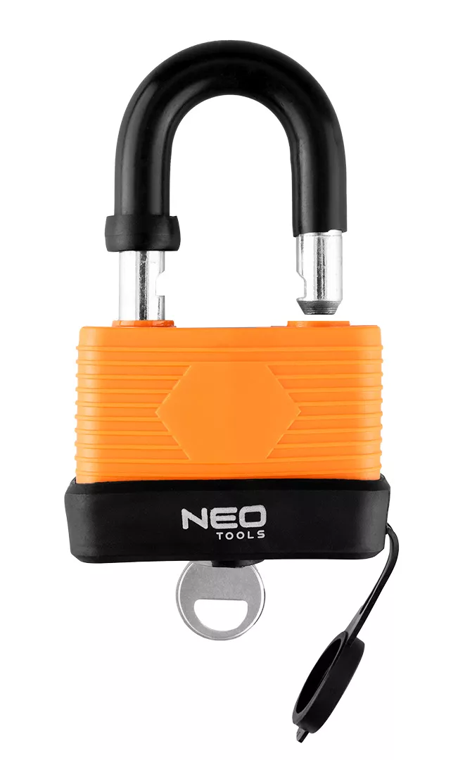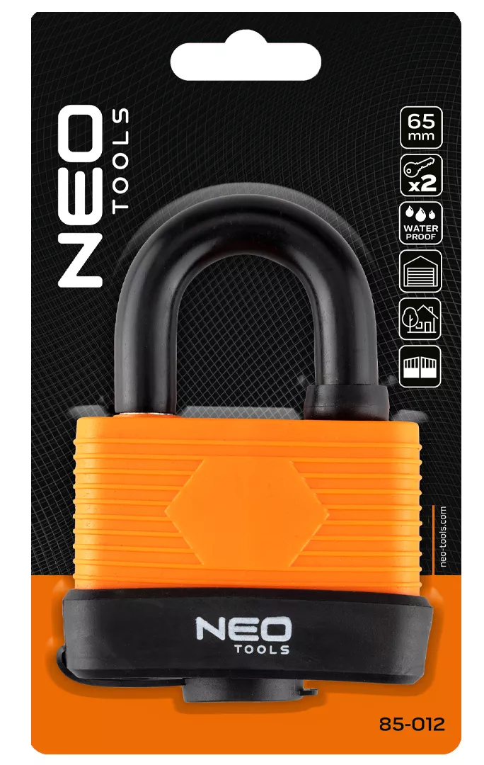 Kłódka wodoodporna laminowana osłona gumowa 65 mm 85-012 marki NEO TOOLS to stalowa kłódka laminowana z plastikową osłoną oraz gumowymi pierścieniami na pałąku. Wyposażona w trzy klucze. Dzięki zastosowanym materiałom i odpowiedniej konstrukcji cechuje się wysoką odpornością na warunki atmosferyczne. Średnica pałąka wynosi 13 mm. To solidne zabezpieczenie, które sprawdzi się w różnych zastosowaniach – zarówno wewnętrznych, jak i zewnętrznych.