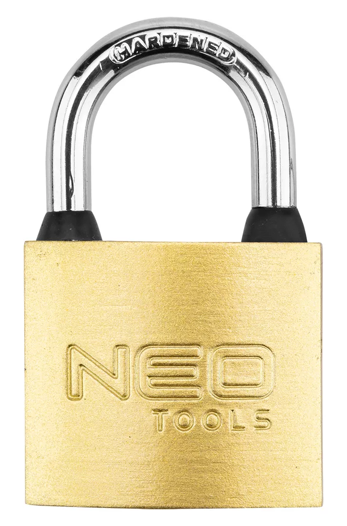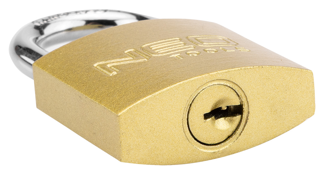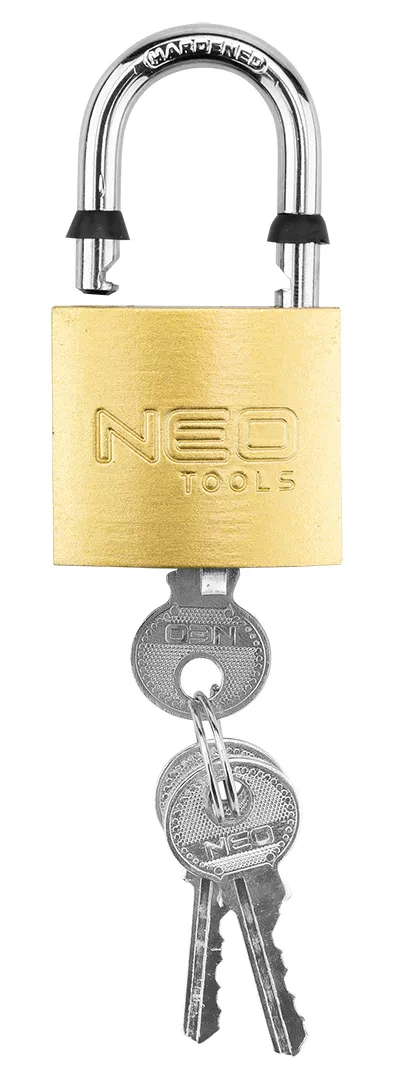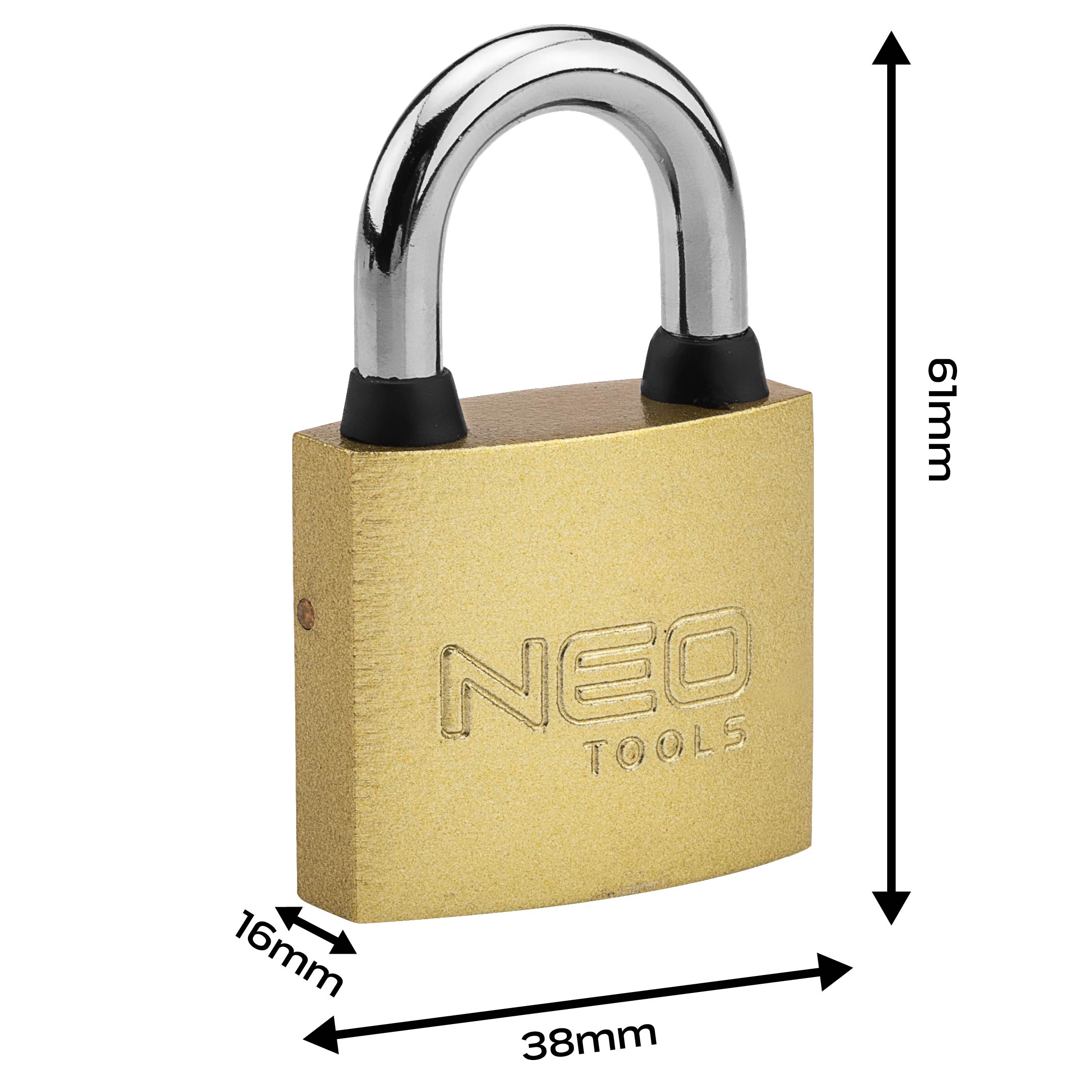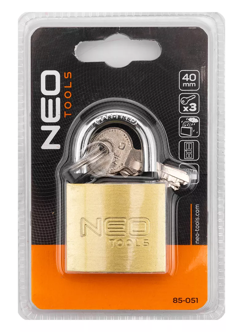 Kłódka 40 mm, 3 klucze 85-051 marki NEO TOOLS to żeliwny model z miedzianą powłoką, wyposażony w 3 klucze. Jarzmo o średnicy 5 mm i wymiarach 38 x 16 x 61 mm zapewnia odpowiednią wytrzymałość, a zastosowane uszczelki chronią mechanizm przed deszczem, zwiększając tym samym odporność kłódki NEO TOOLS na warunki atmosferyczne. To praktyczne zabezpieczenie, które sprawdzi się w różnych zastosowaniach – zarówno wewnątrz, jak i na zewnątrz pomieszczeń.
