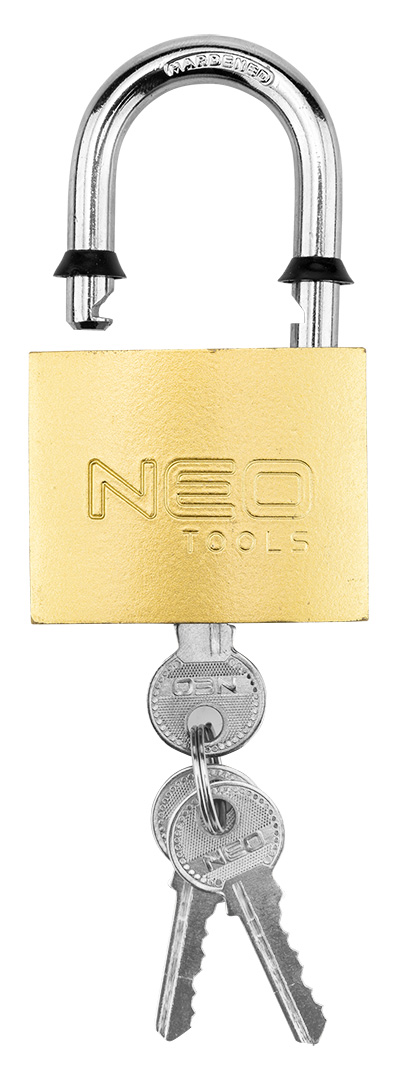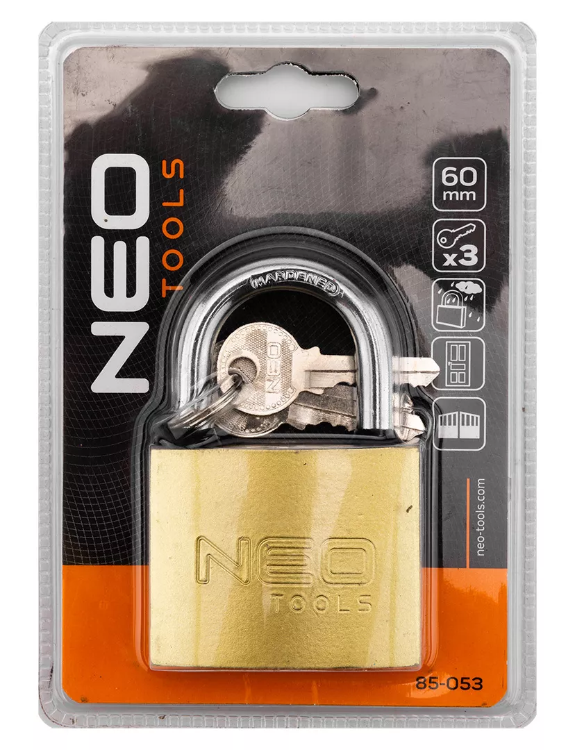 Kłódka 60 mm, 3 klucze 85-053 marki NEO TOOLS to żeliwny model z miedzianą powłoką, wyposażony w 3 klucze. Jarzmo o średnicy 9 mm i wymiarach 62 x 22 x 91 mm zapewnia odpowiednią wytrzymałość, a zastosowane uszczelki chronią mechanizm przed deszczem, zwiększając tym samym odporność kłódki NEO TOOLS na warunki atmosferyczne. To praktyczne zabezpieczenie, które sprawdzi się w różnych zastosowaniach – zarówno wewnątrz, jak i na zewnątrz pomieszczeń.