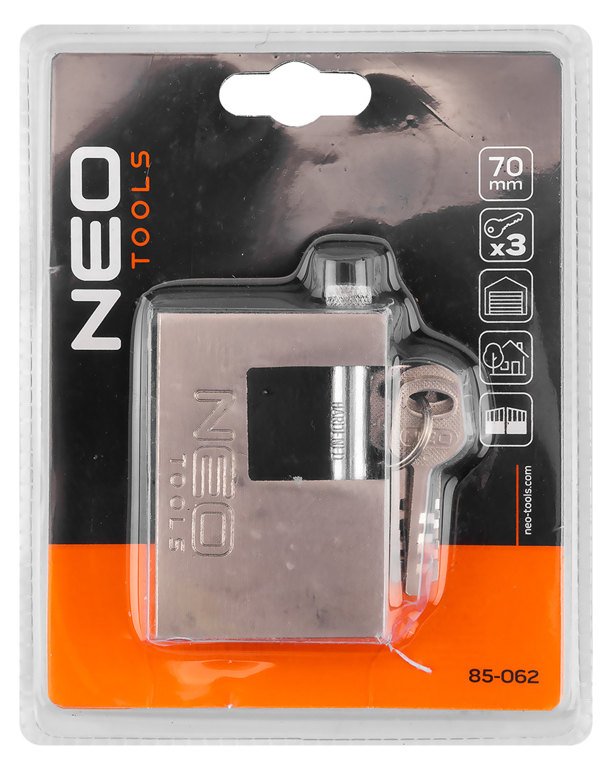 Kłódka trzpieniowa 70 mm, 3 klucze 85-062 marki NEO TOOLS to solidne zabezpieczenie wykonane z żeliwa o wymiarach 69,5 x 50 x 19,5 mm. Wyposażone w mosiężny zamek, charakteryzuje się wysoką odpornością na warunki atmosferyczne. Średnica jarzma tej kłódki trzpieniowej NEO TOOLS wynosi 10 mm. W zestawie znajdują się 3 klucze – zapewniające wygodę użytkowania i dostęp dla kilku osób. Kłódka sprawdzi się jako praktyczne narzędzie ochronne w zastosowaniach codziennych i zewnętrznych.