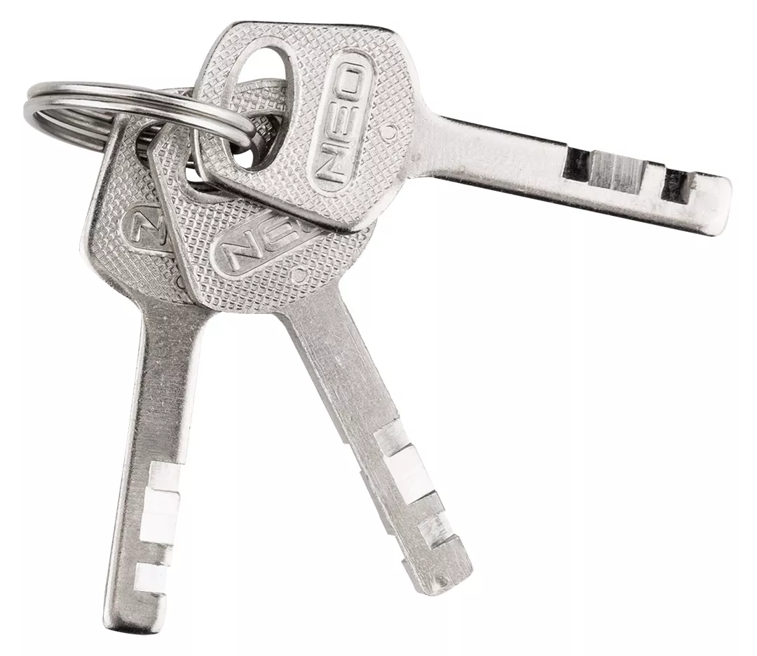 Kłódka 60 mm, 3 klucze 85-065 marki NEO TOOLS to model wyposażony w 3 klucze. Jarzmo o średnicy 10 mm i wymiarach 60 x 20 x 85 mm zapewnia odpowiednią wytrzymałość, a zastosowane uszczelki chronią mechanizm przed deszczem, zwiększając tym samym odporność kłódki NEO TOOLS na warunki atmosferyczne. To praktyczne zabezpieczenie, które sprawdzi się w różnych zastosowaniach – zarówno wewnątrz, jak i na zewnątrz pomieszczeń.