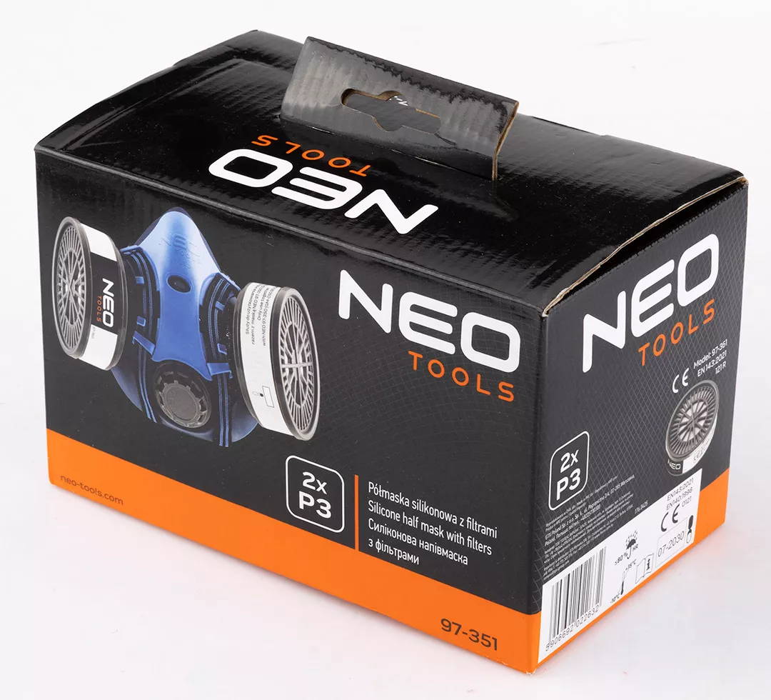 Półmaska silikonowa + 2x Filtr P3, 97-351 marki NEO TOOLS to zestaw obejmujący półmaskę silikonową 97-350 NEO TOOLS oraz dwie sztuki filtrów P3, 97-361 NEO TOOLS. Zapewnia ochronę przed aerozolami zawierającymi cząstki stałe (pyły), dymy oraz ciekłe mgły, o ile stężenie fazy rozproszonej aerozolu nie przekracza 20xNDS. Najczęstsze zastosowania to prace górnicze, kamieniarskie i stolarskie oraz operacje związane z przeładunkiem towarów sypkich czy nawozów sztucznych. Zestaw posiada certyfikat CE na zgodność z normą En140 oraz EN143.