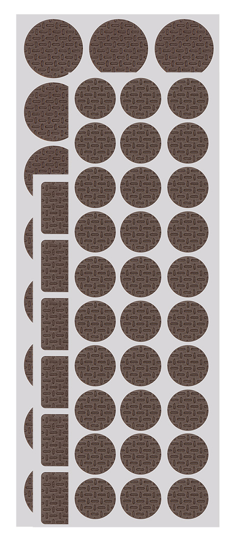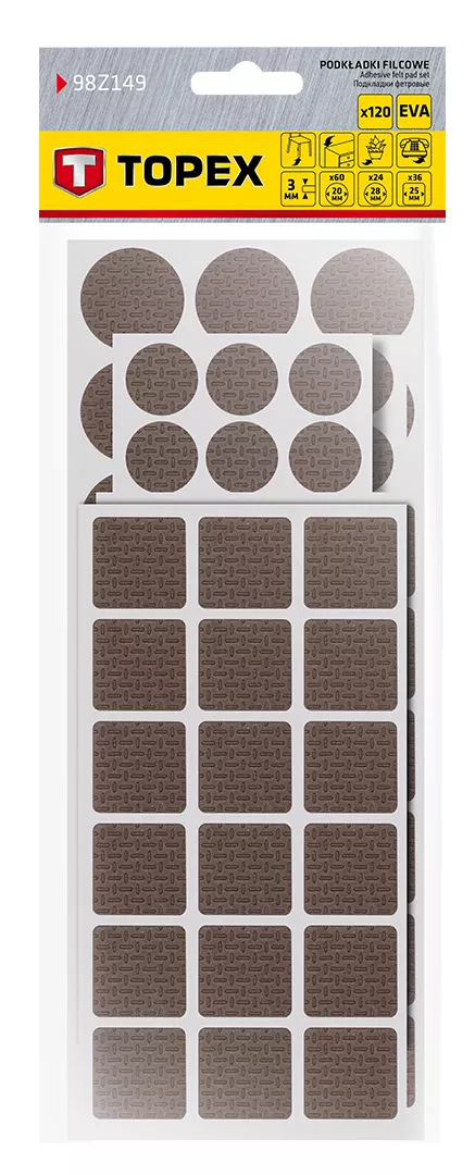 Podkładki piankowe EVA samoprzylepne, brązowe, 120 szt. 98Z149 marki TOPEX to praktyczne podkładki pod meble, zapobiegające rysowaniu podłogi. Wykonane zostały z miękkiej pianki EVA. Oferowane w zestawie 120 sztuk w różnych konfiguracjach: 60 sztuk średnica 20 mm, 24 sztuki średnica 28 mm i 36 sztuk kwadrat 15 mm na 15 mm – każda o grubości 3 mm. Solidne, w uniwersalnym brązowym kolorze.