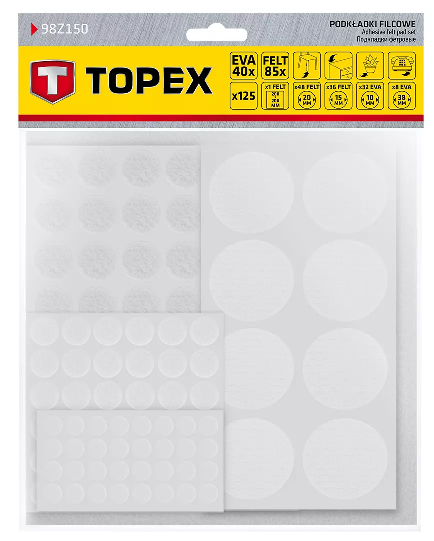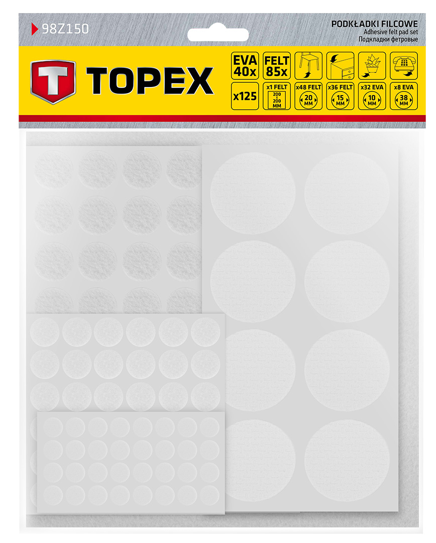 Podkładki filcowe i piankowe EVA samoprzylepne, białe, 125 szt. 98Z150 marki TOPEX to praktyczne podkładki pod meble, zapobiegające rysowaniu podłogi. Wykonane zostały z miękkiej pianki EVA oraz filcu. Oferowane w zestawie 125 sztuk w różnych konfiguracjach: 32 sztuki EVA średnica 10 mm, 1 filcowa 20 x 20 cm, 48 sztuk filcowych średnica 20 mm i 36 sztuk filcowych średnica 15 mm – każda o grubości 3 mm. Solidne, w uniwersalnym białym kolorze.