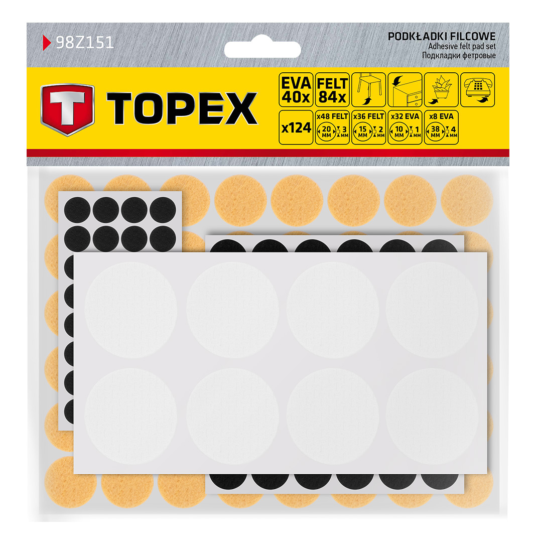Podkładki filcowe i piankowe EVA samoprzylepne, mix, 124 szt. 98Z151 marki TOPEX to praktyczne podkładki pod meble, zapobiegające rysowaniu podłogi. Wykonane zostały z miękkiej pianki EVA oraz filcu. Oferowane w zestawie 124 sztuk w różnych konfiguracjach: 48 sztuk filcowych w kolorze kremowym o średnicy 20 mm i grubości 3 mm, 36 sztuk filcowych w kolorze białym o średnicy 15 mm i grubości 2 mm, 32 sztuki piankowych EVA w kolorze białym o średnicy 10 mm i grubości 1 mm, 8 sztuk piankowych EVA w kolorze białym o średnicy 38 mm i grubości 4 mm. Solidne, w uniwersalnych kolorach.