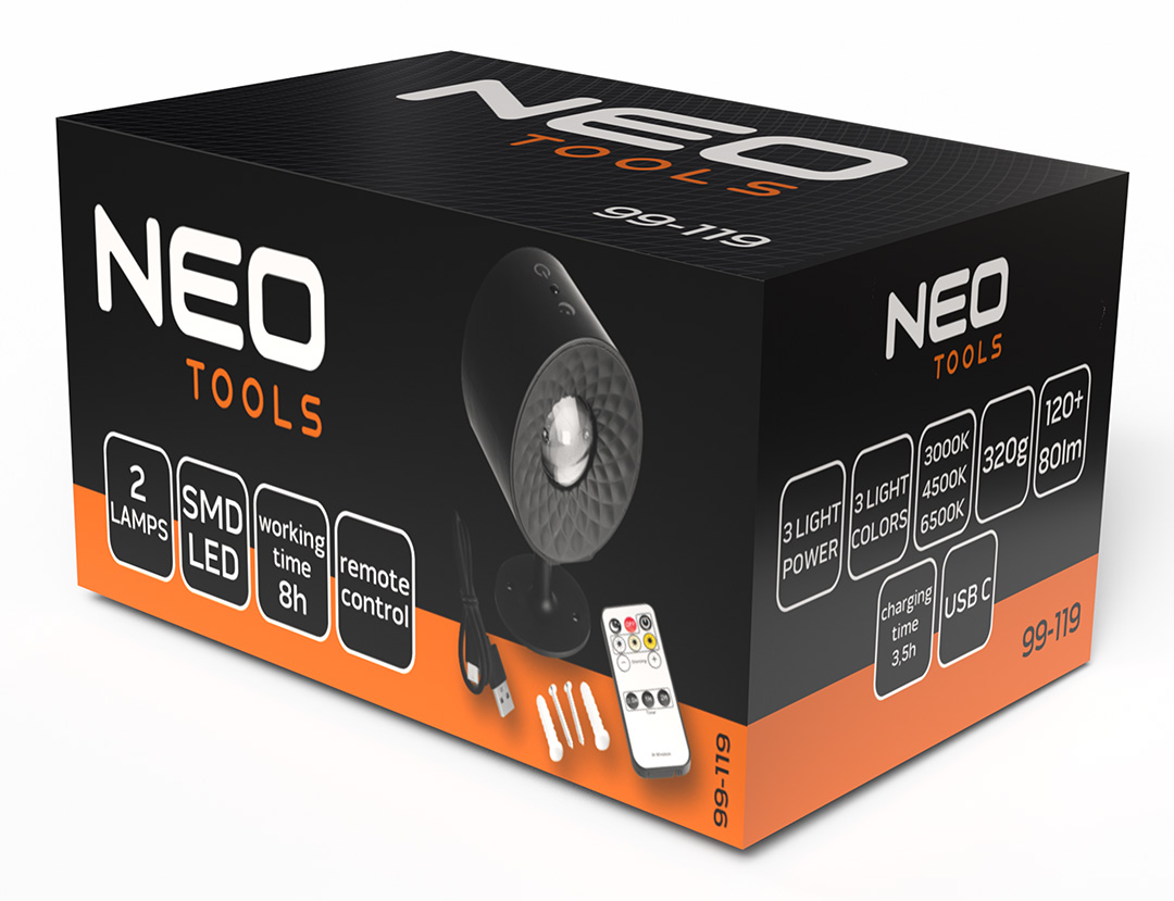 Lampa wewnętrzna LED + pilot 2500 mAh 99-119 marki NEO TOOLS to urządzenie wyposażone w 2 lampy z obu stron: zwykłą (do 130 lumenów) oraz nocną (do 90 lumenów), oferujące 3 moce i 3 barwy światła (3000 K/ 4500 K/ 6500 K). Lampa posiada baterię 18650, 2500 mAh, 1.5 A. Czas jej ładowania wynosi 3,5 godziny, a pracy – aż do 8 godzin. Model lampy wyposażony został w złącze USB C. W zestawie znajduje się przewód USB C o długości 1,2 m oraz praktyczny pilot zdalnego sterowania. Wymiary lampy wynoszą 12 x 8 x 6 cm, a jej waga to zaledwie 320 g. To uniwersalne źródło światła do wielu zastosowań.