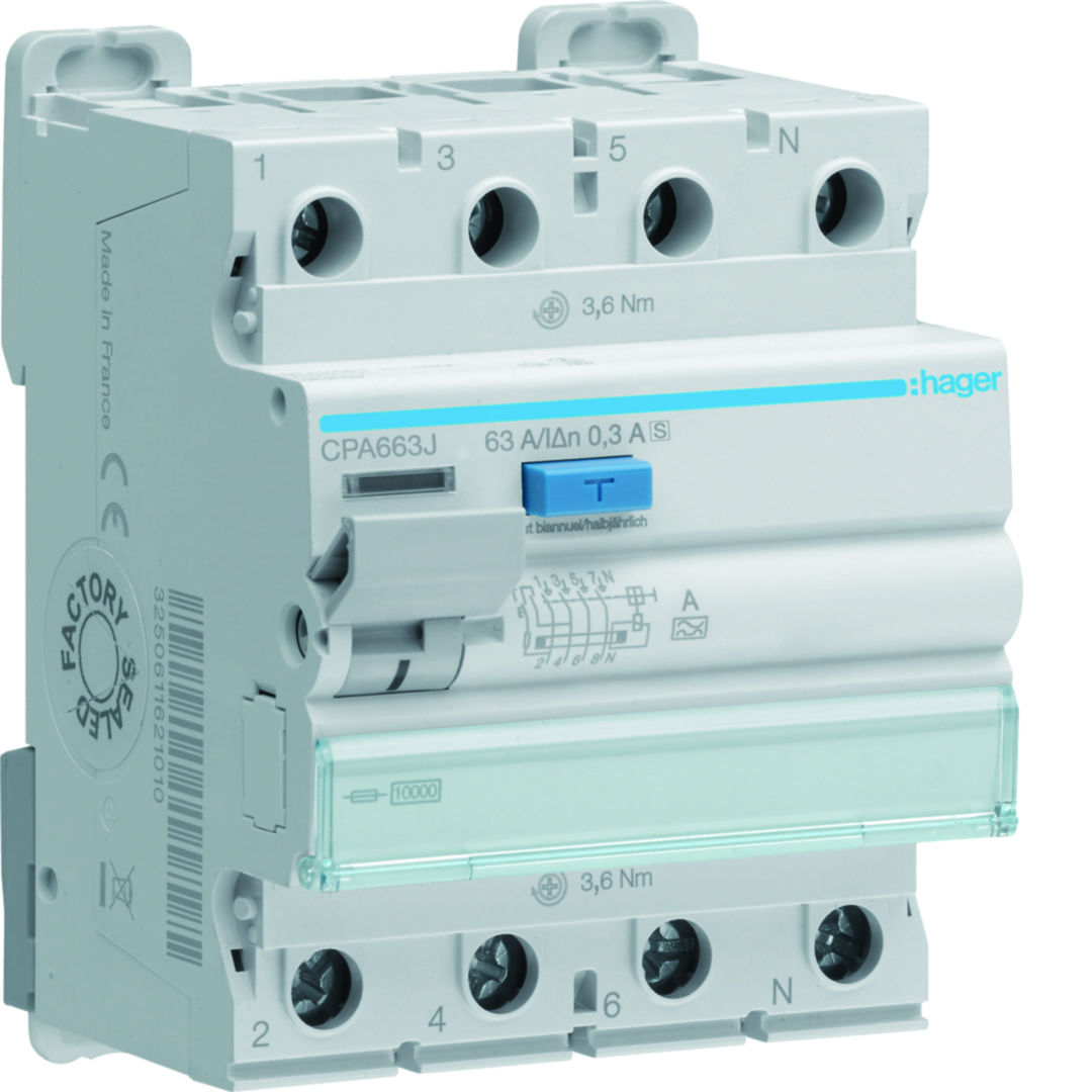 RCCB Wyłącznik różnicowoprądowy 3P+N 63A 300mA 10kA A S