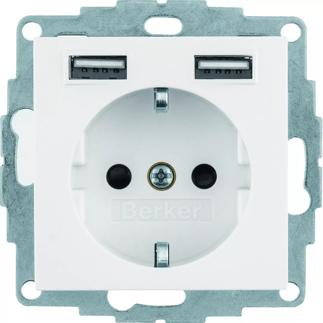 B.x Gniazdo SCHUKO z gniazdem ładowania USB 2,4 A; samozaciski; biały połysk