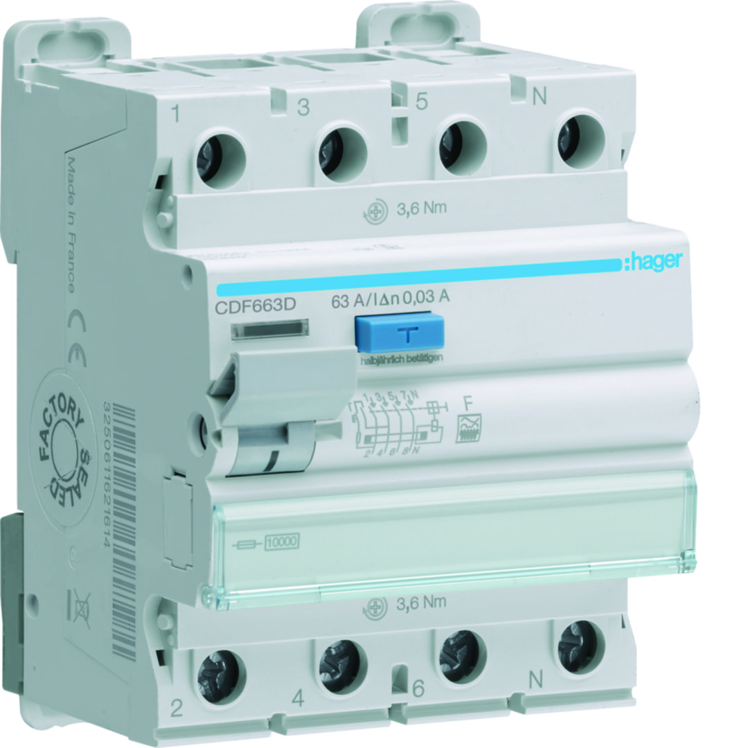 RCCB Wyłącznik różnicowoprądowy 3P+N 63A 30mA 10kA F