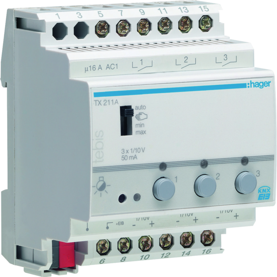 KNX e/s Ściemniacz załączający 1x10V, 50 mA, 3-kanałowy, 4 mod