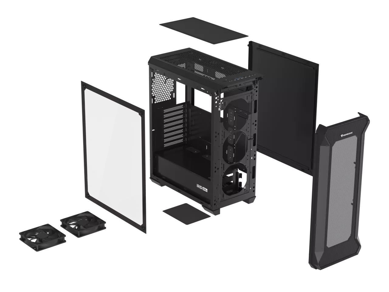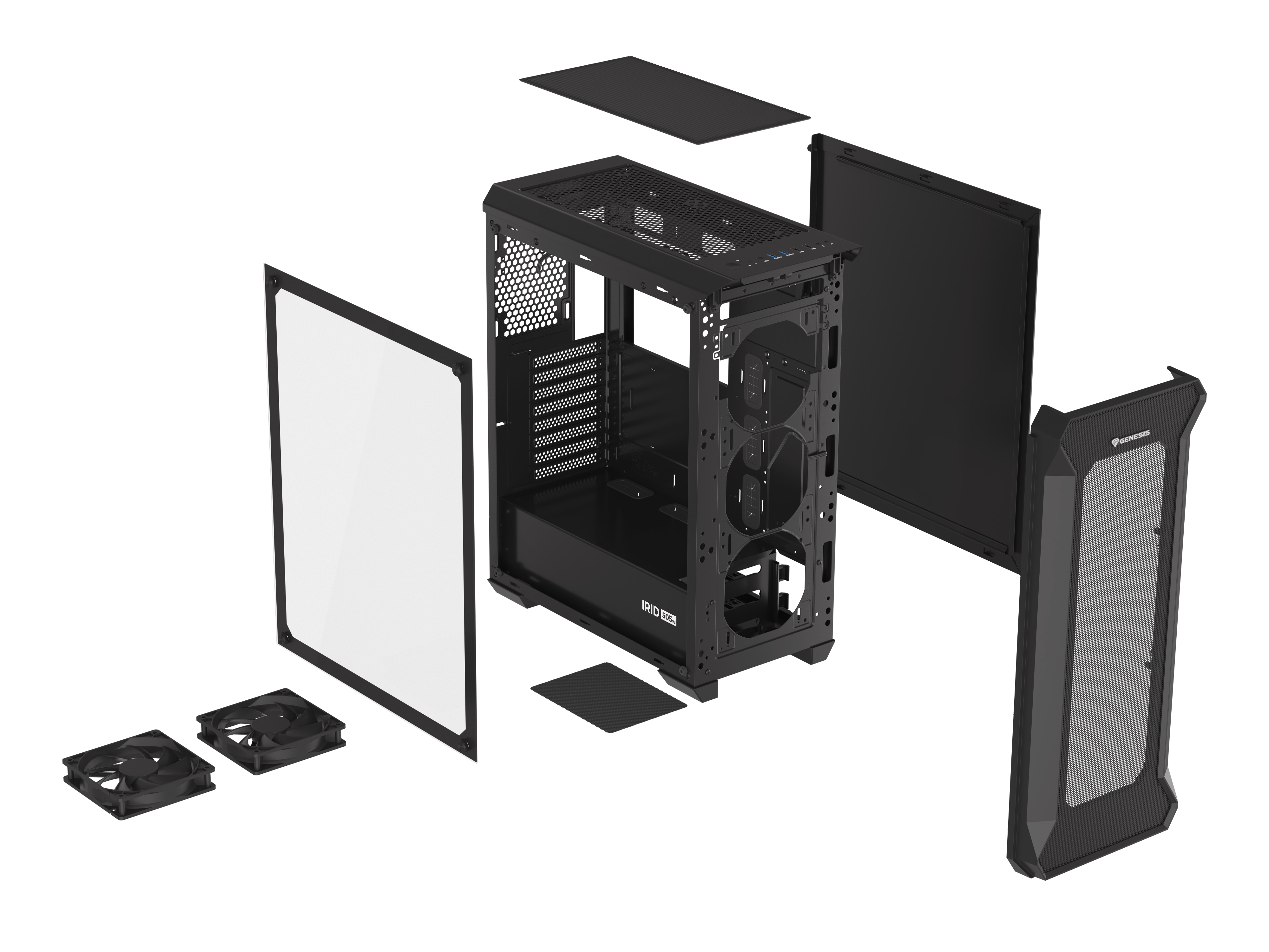 Irid 505 V2 do walki z gorącym powietrzem wykorzystuje dwa, dołączone do zestawu, bardzo ciche wentylatory Genesis Oxal 120. Dzięki nim możliwe staje się zachowanie optymalnego przepływu powietrza, a co za tym idzie - niskiej temperatury. Dodatkowo możesz zamontować łącznie do 6 wentylatorów. Dla możliwie najlepszej wentylacji kart graficznych o długości do 355 mm, przedni wentylator Oxal 120 jest domyślnie zamontowany wewnątrz struktury obudowy. Dla dłuższych kart graficznych (do 380 mm), najlepszy przepływ powietrza zapewnia konfiguracja z przednimi wentylatorami umieszczonymi na zewnątrz struktury, co możesz łatwo wykonać samodzielnie.
