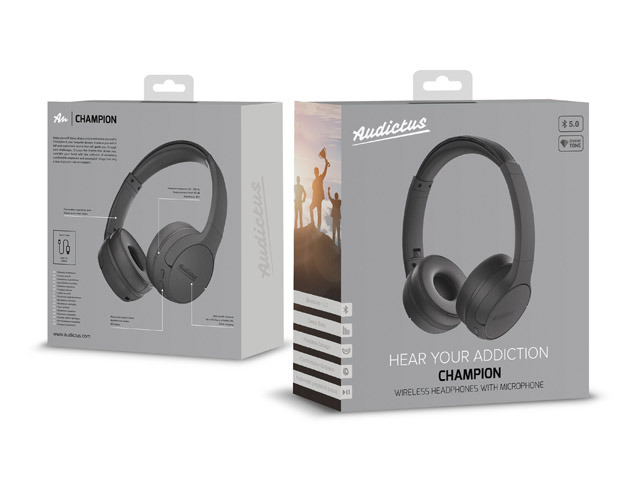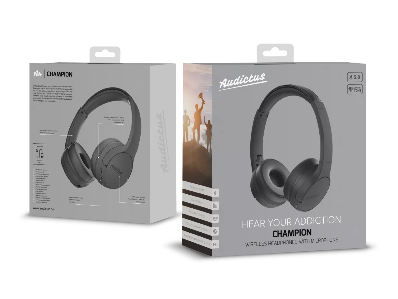 Audictus Champion to uniwersalny, bezprzewodowy zestaw, który wyróżnia się nie tylko szczegółowym brzmieniem, ale też wygodą i funkcjonalnością godną każdego miłośnika audio. Słuchaj ulubionej muzyki, rozmawiaj przez wbudowany mikrofon i korzystaj z zestawu nawet do 50 godzin. Wyraź siebie z Audictus Champion.