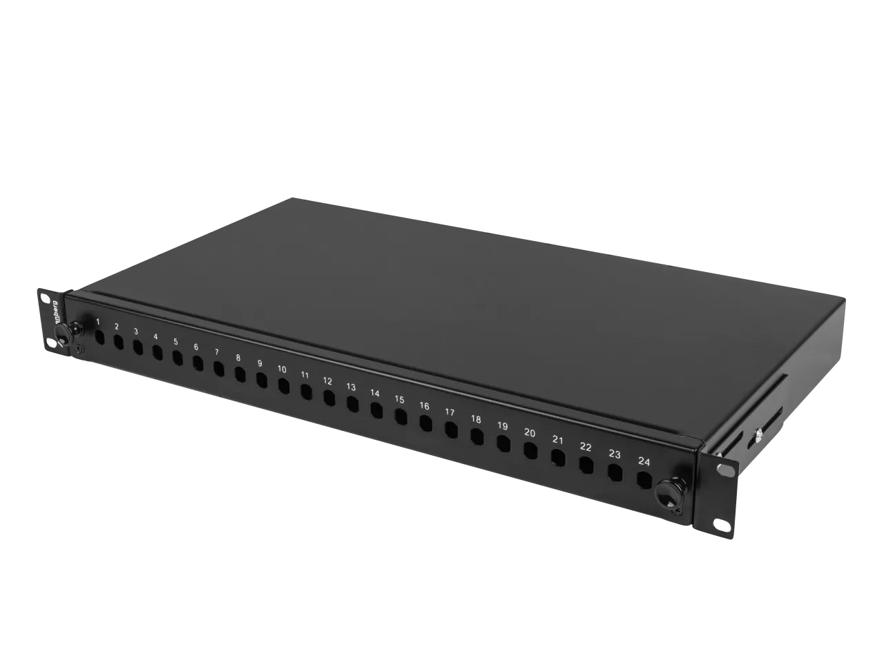 Przełącznica światłowodowa wysuwana z akcesoriami montażowymi o wysokości 1U to produkt przeznaczony do montażu wewnątrz szaf teleinformatycznych o szerokości 19". Wykonana została w całości z wytrzymałej blachy stalowej lakierowanej proszkowo. Panel przedni wyposażony został w numerację portów oraz otwory na śruby do lepszego mocowania adapterów. Za pomocą przedniego panelu możemy wysunąć lub zdjąć szufladę przełącznicy, która zapewnia dobrą organizację oraz instalację kabli światłowodowych, dodatkowo panel tylny szuflady został wyposażony w 5 wejść kablowych. Uchwyty tzw. „uszy” rackowe są regulowane, co pozwala na bezproblemowe dopasowanie przełącznicy pod wymagania konkretnego użytkownika w szafie teleinformatycznej.
