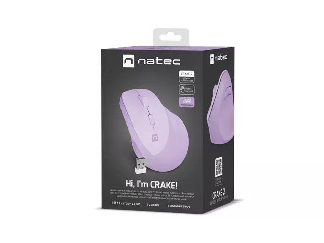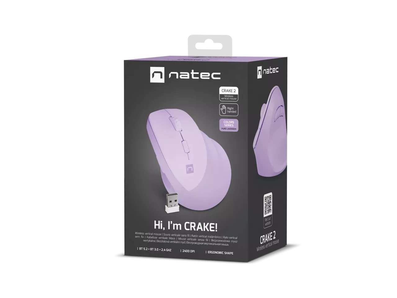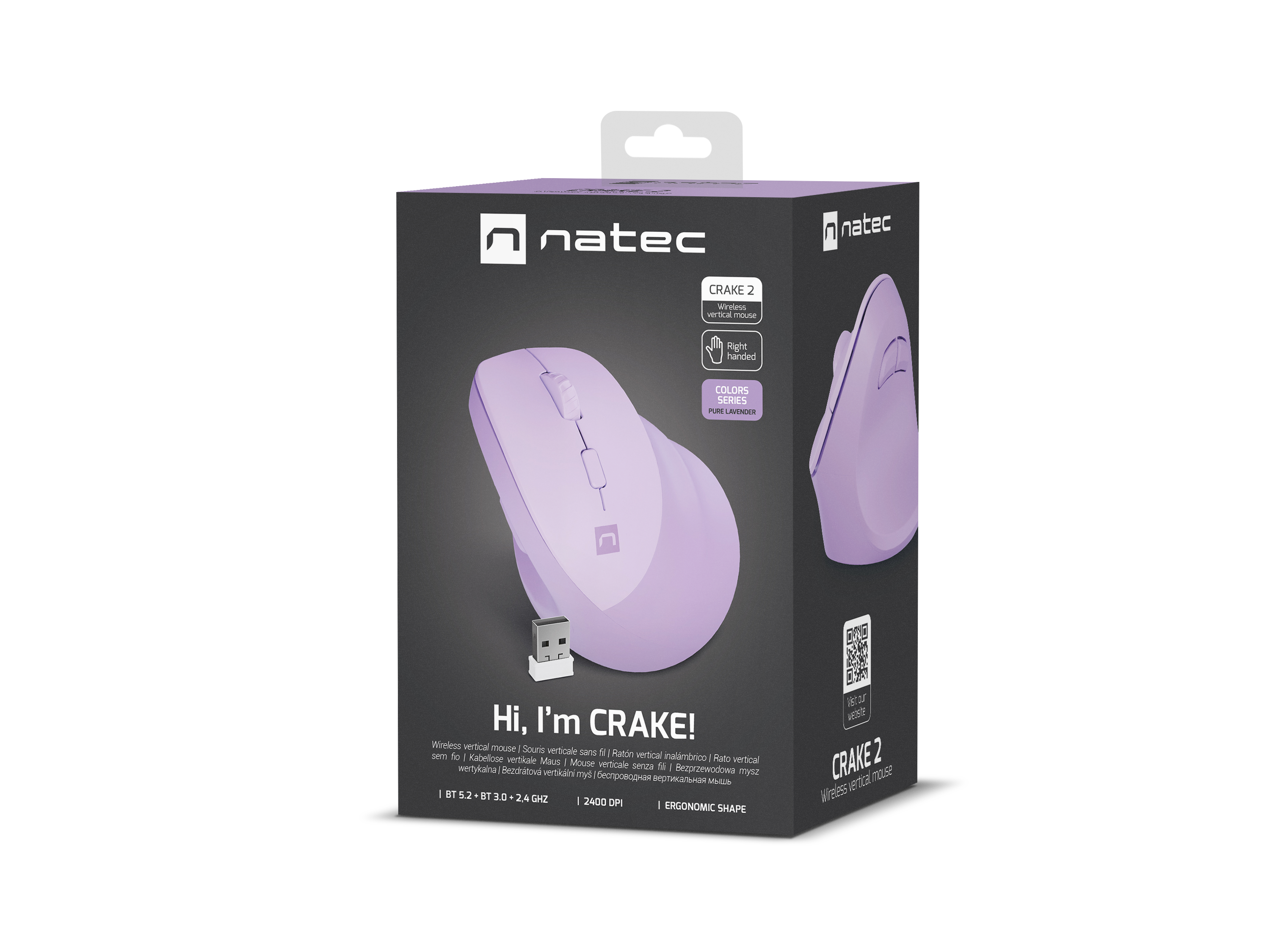 MYSZ WERTYKALNA NATEC CRAKE 2 BEZPRZEWODOWA 2400DPI BLUETOOTH 5.2 + 2.4GHZ PURE LAVENDER