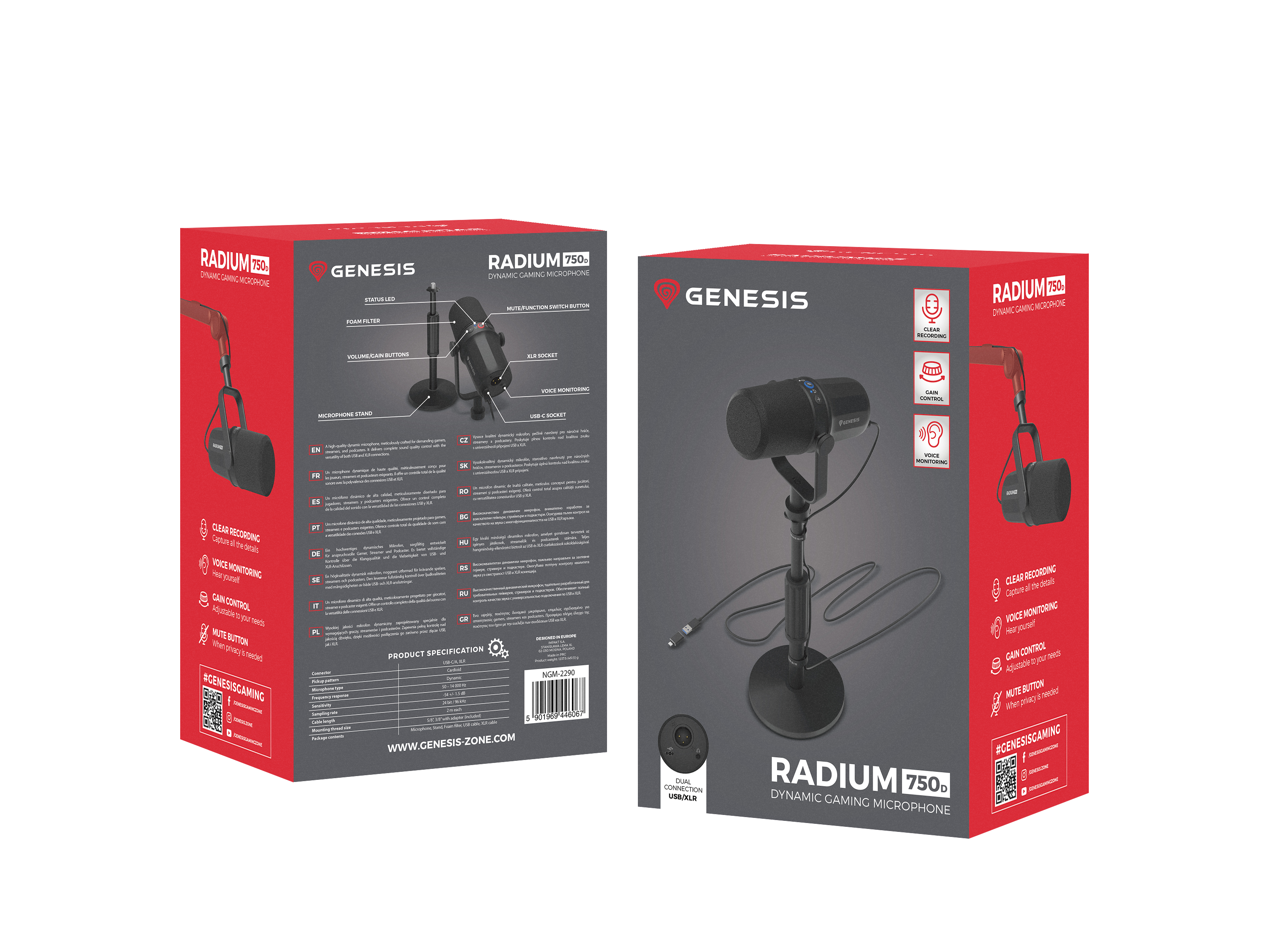 Dwa złącza - USB i XLR - zapewniają pełną swobodę w doborze sprzętu, z którym użyjesz mikrofonu. Złącze USB umożliwia natychmiastowe działanie zaraz po wyjęciu urządzenia z pudełka (np. z komputerem lub konsolą), natomiast XLR pozwala podłączyć mikrofon do interfejsu audio i wejść na jeszcze wyższy poziom jakości dźwięku. Radium 750D zawsze dopasuje się do Twojego setupu.