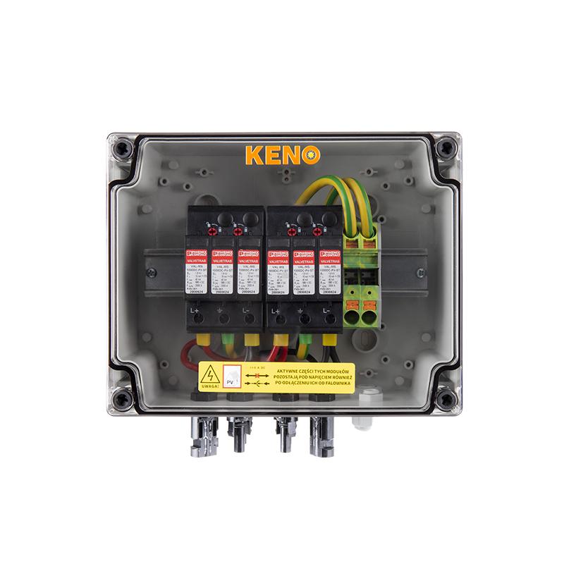 Rozdzielnica przyłączeniowa polskiego producenta KENO realizuje ochronę przed skutkami wyładowań pośrednich po stronie prądu stałego. Przeznaczona jest do stosowania w uziemionych i izolowanych instalacjach fotowoltaicznych. Dzięki wysokiemu stopniu ochrony IP możliwy montaż na zewnątrz. Konstrukcja rozdzielnicy przeznaczona do montażu natynkowego. Rozdzielnice w zależności od wyposażenia mogą realizować różne funkcje.