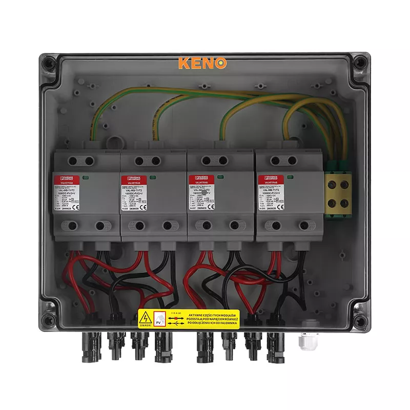 Rozdzielnica przyłączeniowa polskiego producenta KENO realizuje ochronę przed skutkami wyładowań pośrednich oraz bezpośrednich po stronie prądu stałego. Przeznaczona jest do stosowania w uziemionych i izolowanych instalacjach fotowoltaicznych. Dzięki wysokiemu stopniu ochrony IP możliwy montaż na zewnątrz. Konstrukcja rozdzielnicy przeznaczona do montażu natynkowego. Rozdzielnice w zależności od wyposażenia mogą realizować różne funkcje.