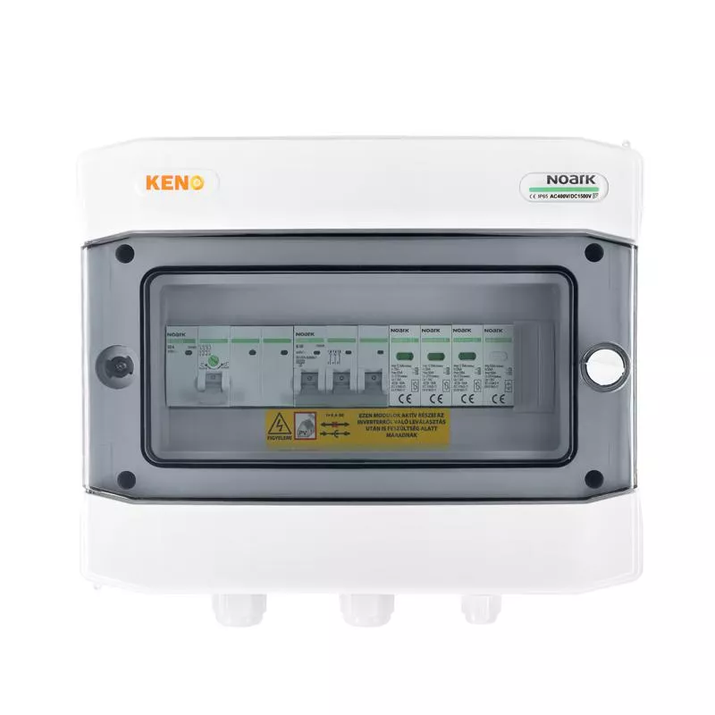 Rozdzielnica przyłączeniowa polskiego producenta KENO przeznaczona jest do zasilania falowników fotowoltaicznych w uziemionych i izolowanych instalacjach fotowoltaicznych. Realizuje ochronę przed skutkami zwarć i przeciążeń, a także ochronę przed skutkami wyładowań pośrednich oraz bezpośrednich po stronie prądu zmiennego. Dzięki wysokiemu stopniu ochrony IP możliwy montaż na zewnątrz. Konstrukcja rozdzielnicy przeznaczona do montażu natynkowego. Rozdzielnice w zależności od wyposażenia mogą realizować różne funkcje.