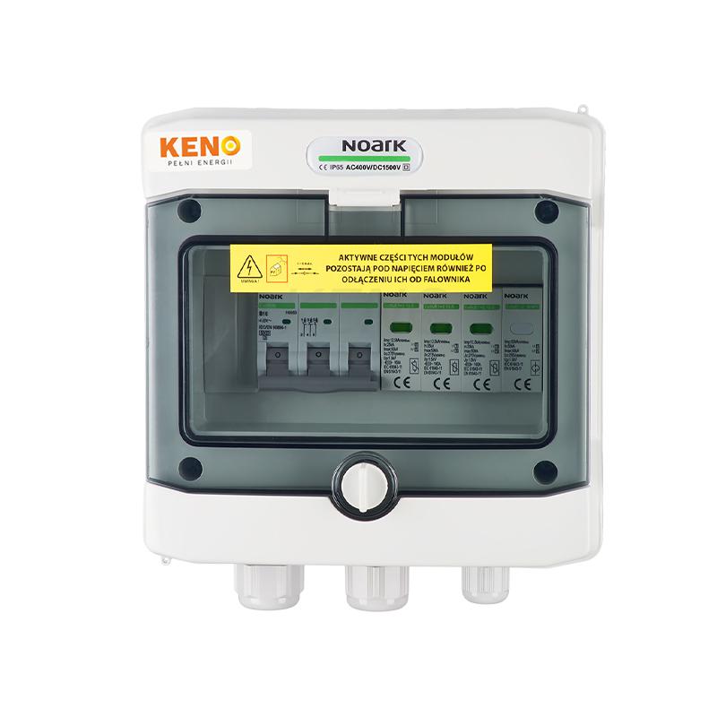 Rozdzielnica przyłączeniowa polskiego producenta KENO przeznaczona jest do zasilania falowników fotowoltaicznych w uziemionych i izolowanych instalacjach fotowoltaicznych. Realizuje ochronę przed skutkami zwarć i przeciążeń, a także ochronę przed skutkami wyładowań pośrednich oraz bezpośrednich po stronie prądu zmiennego. Dzięki wysokiemu stopniu ochrony IP możliwy montaż na zewnątrz. Konstrukcja rozdzielnicy przeznaczona do montażu natynkowego. Rozdzielnice w zależności od wyposażenia mogą realizować różne funkcje.