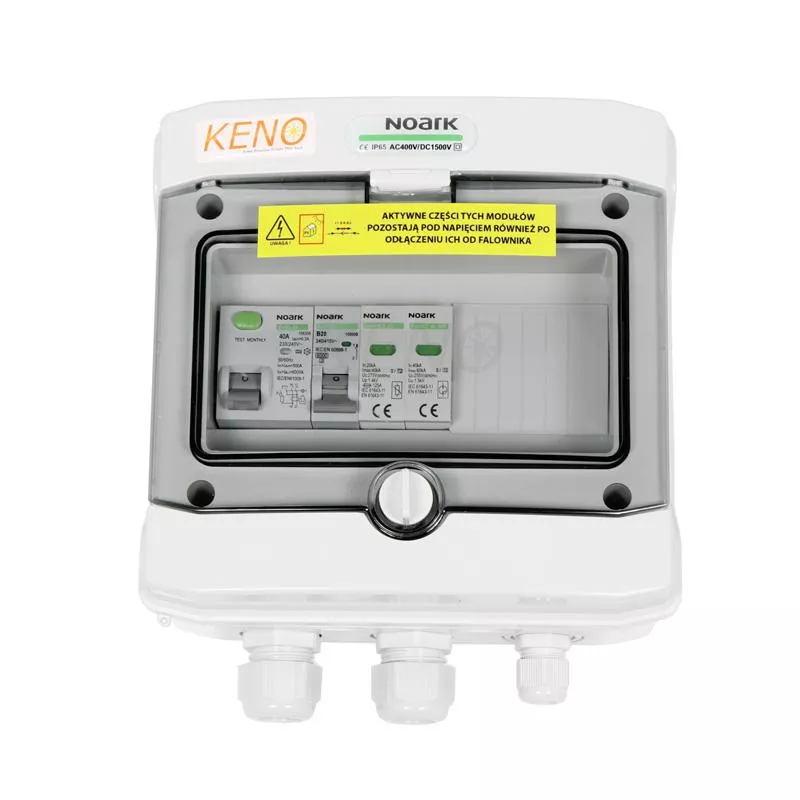 Rozdzielnica przyłączeniowa polskiego producenta KENO przeznaczona jest do zasilania falowników fotowoltaicznych w uziemionych i izolowanych instalacjach fotowoltaicznych. Realizuje ochronę przed skutkami zwarć i przeciążeń, a także ochronę przed skutkami wyładowań pośrednich po stronie prądu zmiennego. Dzięki wysokiemu stopniu ochrony IP możliwy montaż na zewnątrz. Konstrukcja rozdzielnicy przeznaczona do montażu natynkowego. Rozdzielnice w zależności od wyposażenia mogą realizować różne funkcje.