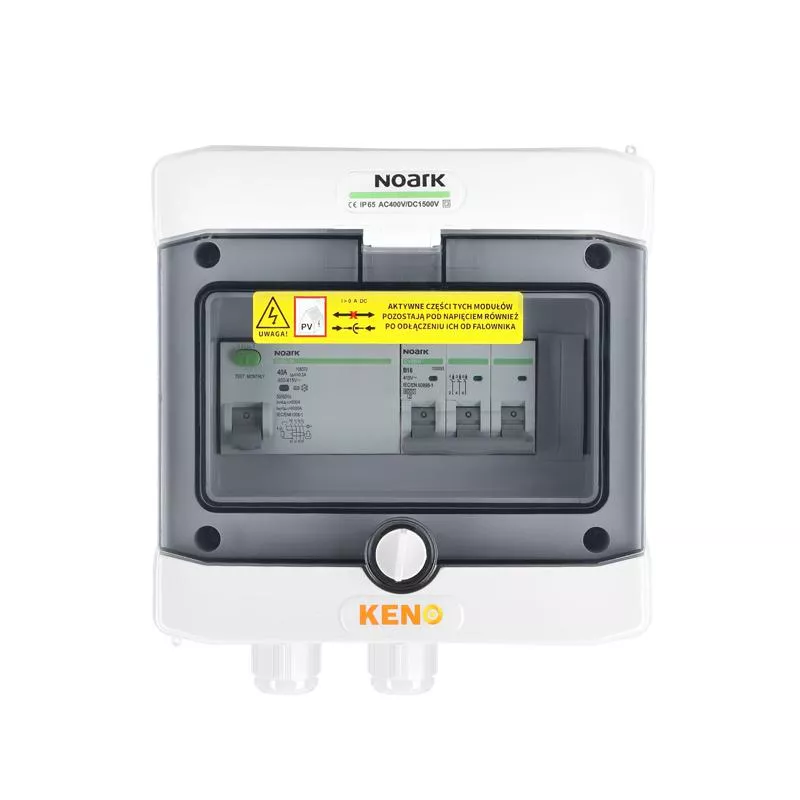 Rozdzielnica przyłączeniowa polskiego producenta KENO przeznaczona jest do zasilania falowników fotowoltaicznych w uziemionych i izolowanych instalacjach fotowoltaicznych. Realizuje ochronę przed skutkami zwarć i przeciążeń. Dzięki wysokiemu stopniu ochrony IP możliwy montaż na zewnątrz. Konstrukcja rozdzielnicy przeznaczona do montażu natynkowego. Rozdzielnice w zależności od wyposażenia mogą realizować różne funkcje.