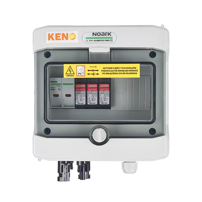 Rozdzielnica przyłączeniowa polskiego producenta KENO realizuje ochronę przed skutkami wyładowań pośrednich oraz bezpośrednich po stronie prądu stałego. Przeznaczona jest do stosowania w uziemionych i izolowanych instalacjach fotowoltaicznych. Dzięki wysokiemu stopniu ochrony IP możliwy montaż na zewnątrz. Konstrukcja rozdzielnicy przeznaczona do montażu natynkowego. Rozdzielnice w zależności od wyposażenia mogą realizować różne funkcje.