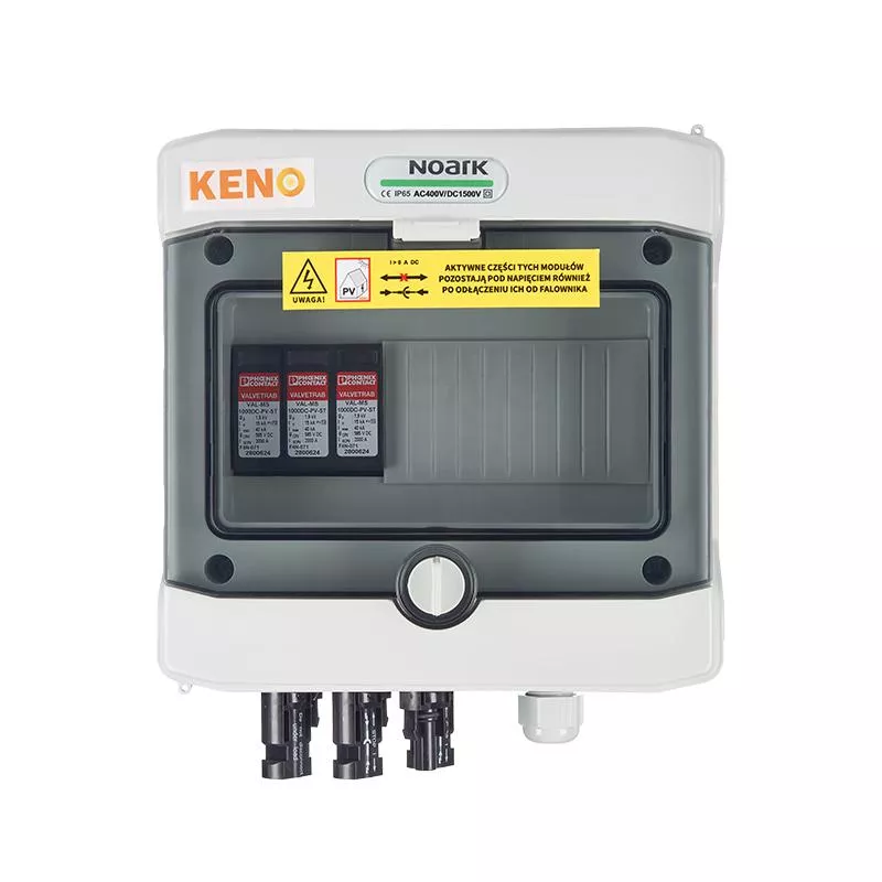 Rozdzielnica przyłączeniowa polskiego producenta KENO realizuje ochronę przed skutkami wyładowań pośrednich po stronie prądu stałego. Przeznaczona jest do stosowania w uziemionych i izolowanych instalacjach fotowoltaicznych. Dzięki wysokiemu stopniu ochrony IP możliwy montaż na zewnątrz. Konstrukcja rozdzielnicy przeznaczona do montażu natynkowego. Rozdzielnice w zależności od wyposażenia mogą realizować różne funkcje.