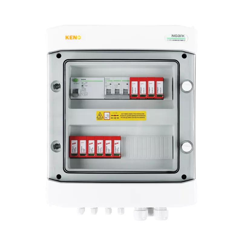 Rozdzielnica przyłączeniowa DC+AC z ogranicznikiem przepięć Dehn 1000V typu 2, 2 x łańcuch PV, 2 x MPPT // ogr. AC typ 2, 25A 3-F, róż. 100mA 40A (Dławiki)