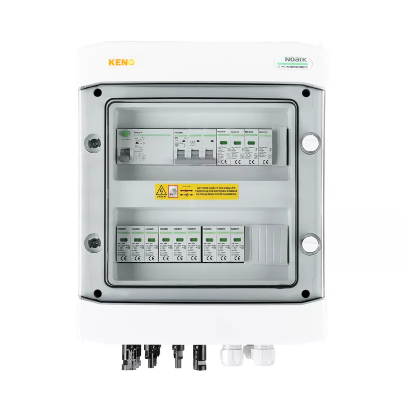 Rozdzielnica przyłączeniowa DC+AC z ogranicznikiem przepięć Noark 1000V typu 1+2, 3x łańcuch PV, 3x MPPT // ogr. AC Noark typ 1+2, 40A 3-F, RCD typ A 40A/300mA